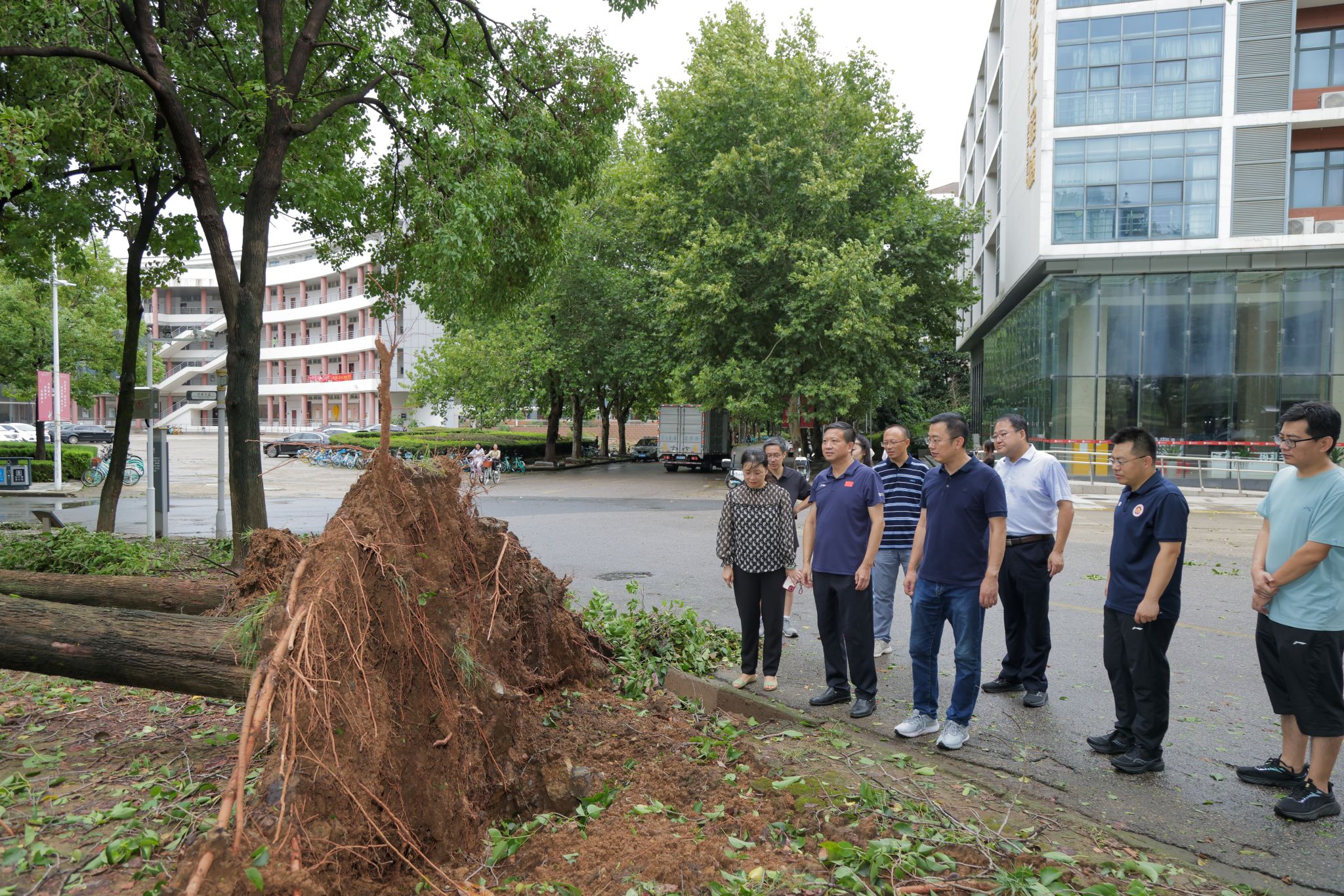 张利民书记一行深入了解了仙林校区在校师生的学习生活状态,先后察看了博远楼大厅廊顶,济成大道、经纶路的户外设施、树木受台风影响造成的损失情况,指导顶棚修复、校园内倒伏树木清运等工作,对校内房屋门窗、户外设施、排水管道等进行了逐一检查。李煜副校长检查了桥头校区中心配电房、电教楼、图书馆、行政楼、环校路、食堂、商铺、宿舍区等,详细询问了校区各场馆场所、设施设备、树木、校园供电专线受损情况及当前供电现状,重点察看了环校路围墙倒伏现场。