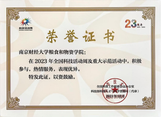 近日,粮食和物资学院收到全国科普工作联席会议办公室、科技部科技人才与科学普及司颁发的荣誉证书,表彰粮食和物资学院在2023年全国科技活动周及重大示范活动中,积极参与,热情服务,表现优异。