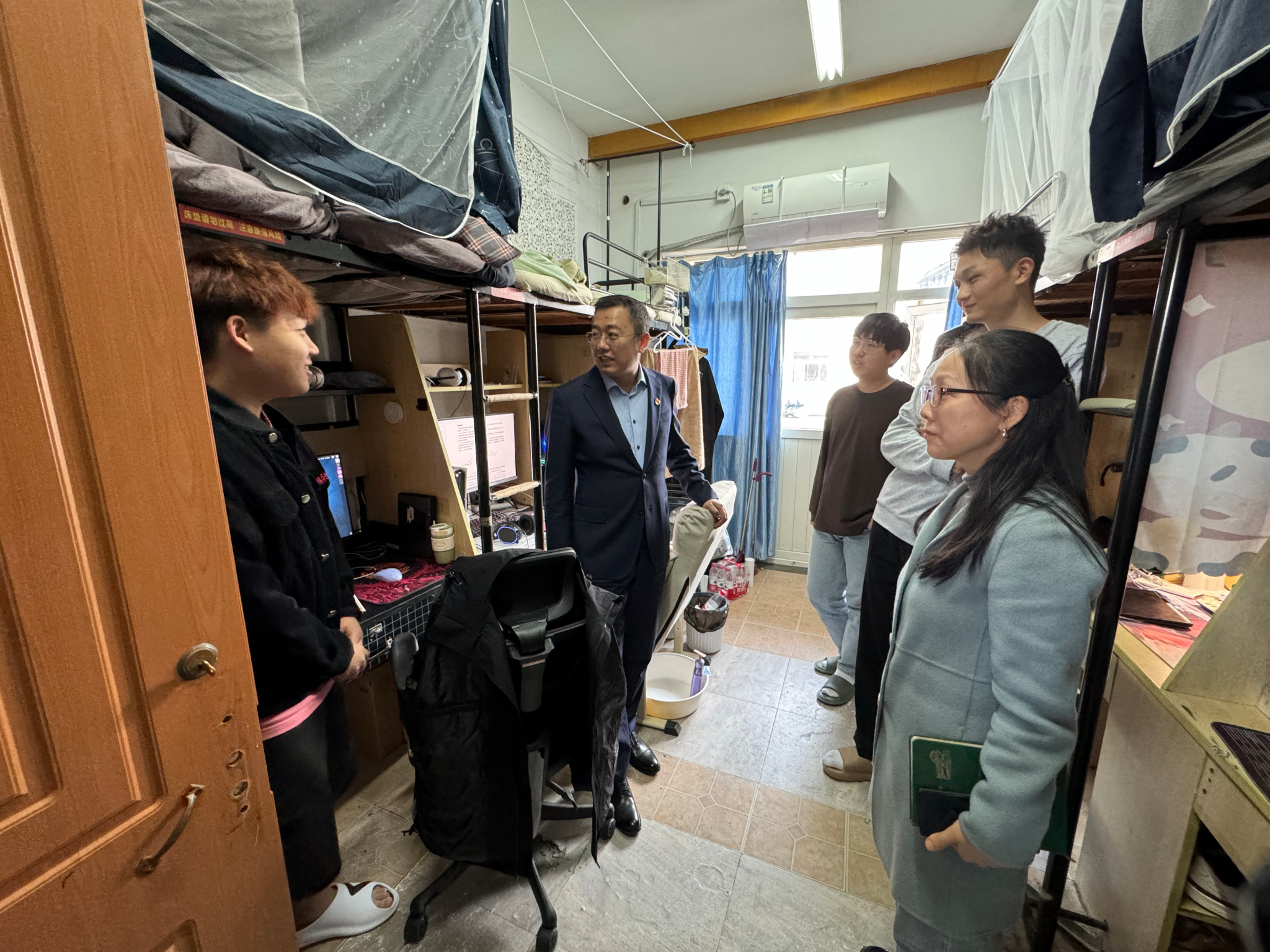 读书会结束后,赵国栋副校长又来到新生宿舍,与研究生新生面对面交流,详细了解同学们在思想、学习、生活和未来规划方面的困惑和想法。他表示,学校始终坚持提升育人能力和管理水平,尽最大努力为同学们创造更好的学习生活环境,希望同学们在学习和科研的道路上保持积极心态,勇于克服困难,不断提升自我。