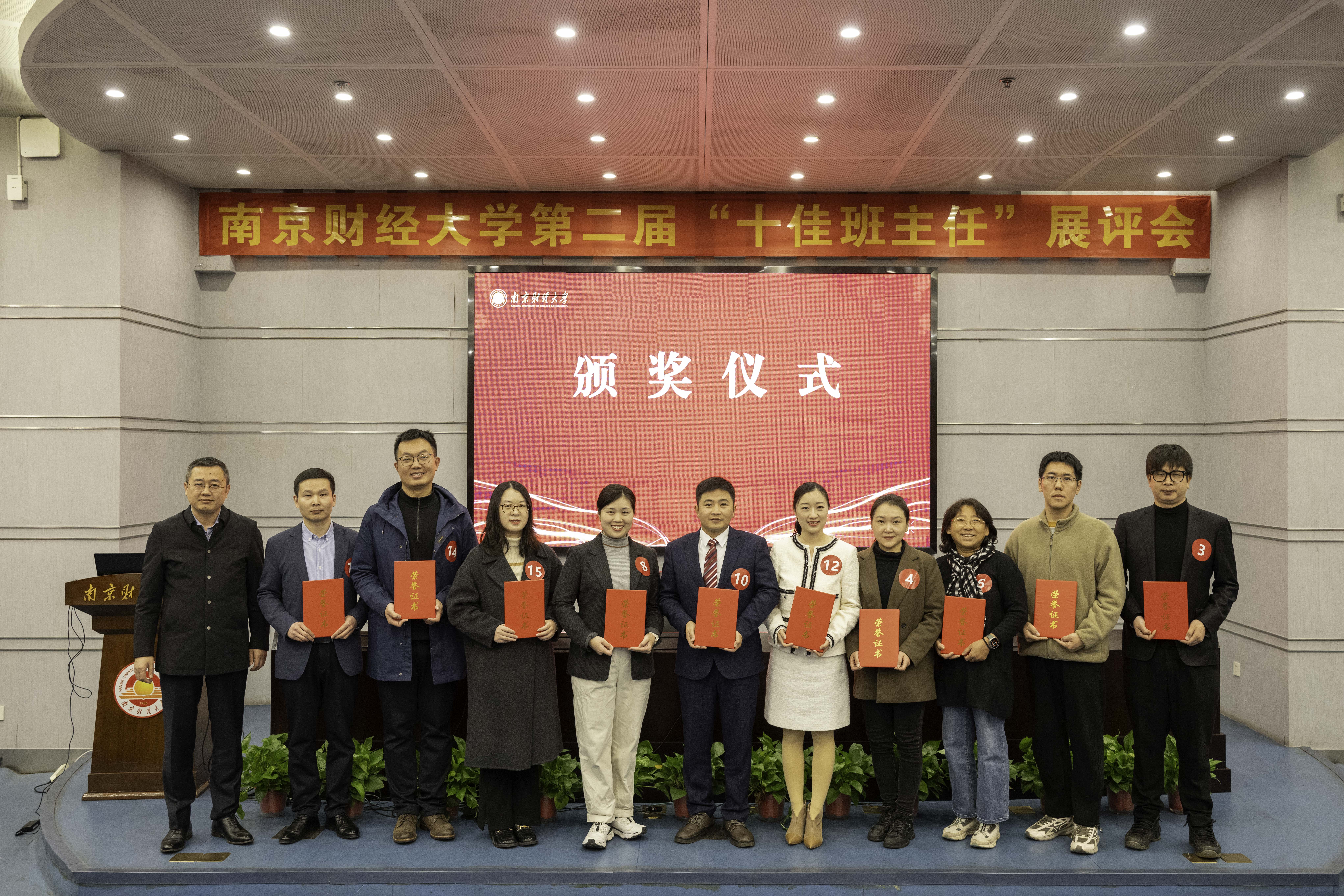 赵国栋为获奖老师颁发证书并合影留念。法学院朱彤等10位老师获评校2024年“十佳班主任”,财政与税务学院高玉胭等5位老师获“十佳班主任”提名奖。