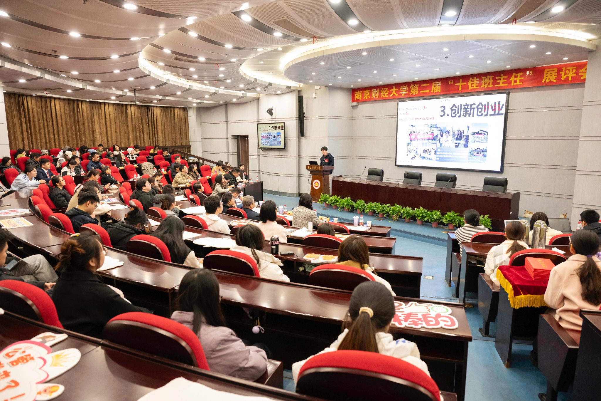 为进一步推进伟德官网班主任队伍建设,提升班主任的专业素养和育人能力,加强优秀班主任典型事迹和工作经验的宣传交流,12月4日下午,伟德官网第二届“十佳班主任”展评会在仙林校区行政楼二楼报告厅举办。党委常委、副校长赵国栋出席展评会并颁奖,南京师范大学学生工作处处长兼党委学生工作部部长景飞,南京信息工程大学学生工作部部长、学生工作处处长李健,伟德官网党委教师工作部部长、人事处处长杨文建,党委研究生工作部部长郝园园,党委学生工作部部长、学生处处长韩力争担任评委。党委学工部思政科工作人员,各学院班主任代表、辅导员代表和学生代表到场学习观摩。展评会由金融学院辅导员刘天钰主持。