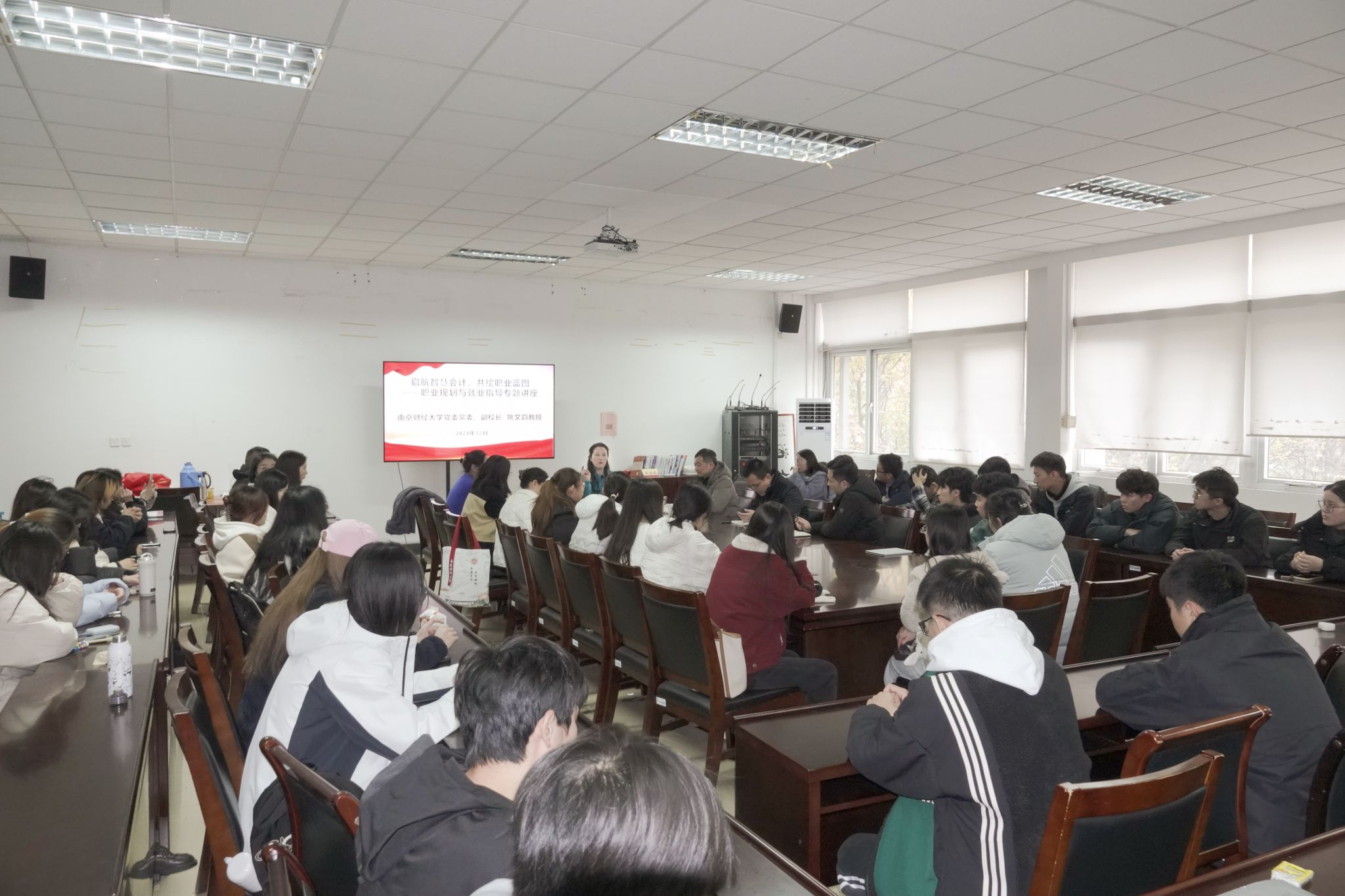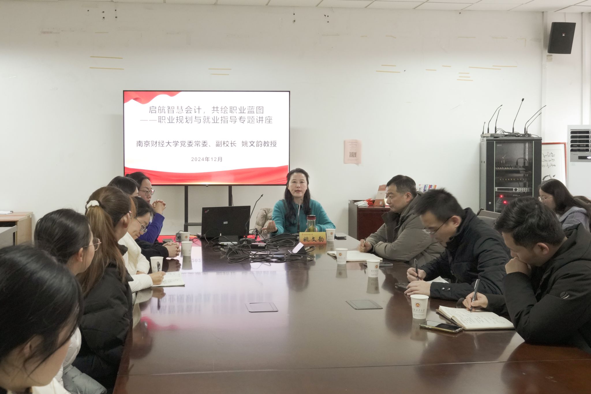 为深入学习贯彻党的二十届三中全会精神和全国教育大会精神、落实落细国家对于高等教育与就业工作的新要求,12月4日下午,党委常委、副校长姚文韵面向2022级和2021级智慧会计方向班学子开展了一场以“启航智慧会计,共绘职业蓝图”为主题的职业规划与就业指导专题讲座,旨在通过高屋建瓴的规划与指导,为学子们铺设一条通往未来职业成功的宽广道路。国际合作与交流处处长杨智华,会计学院副院长(主持工作)李翔、党委副书记布丹丹以及智慧会计2201班、2101班全体学生等参加讲座。讲座由李翔副院长主持。