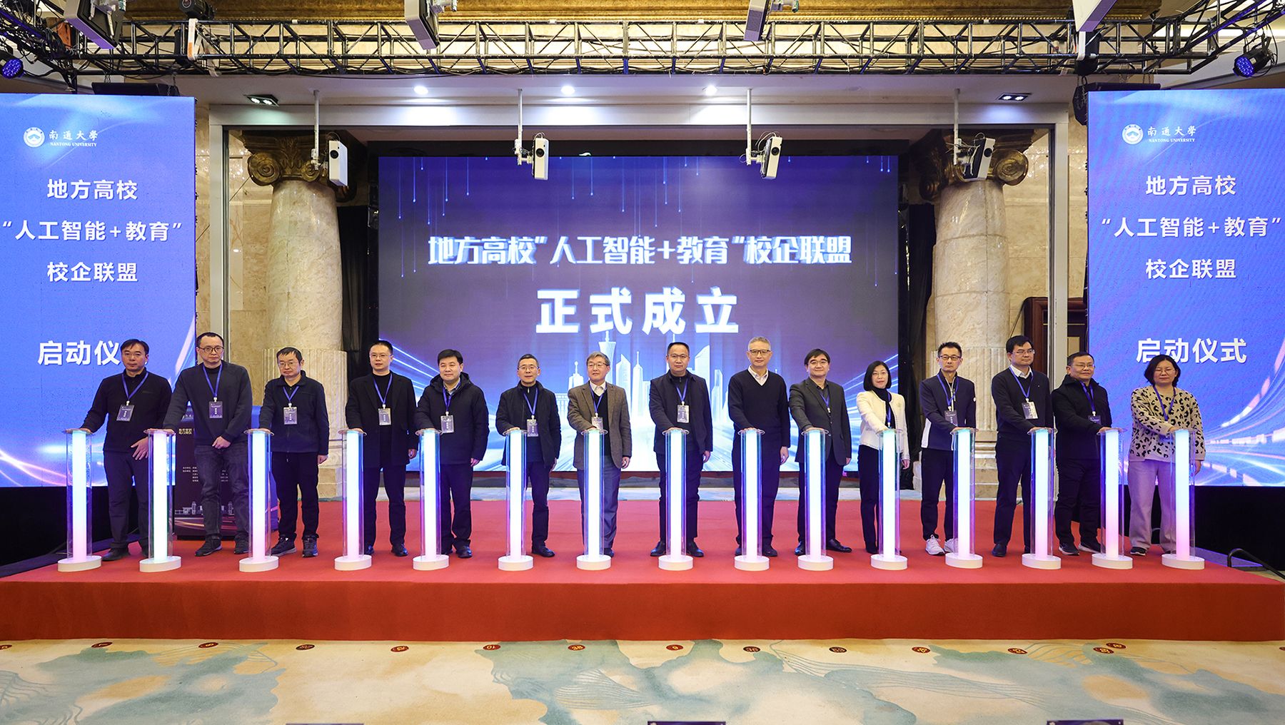 联盟成立大会上,南通大学、伟德bv国际体育、苏州大学、江苏大学、南京师范大学、南京邮电大学、扬州大学、南京医科大学、南京工程学院、金陵科技学院、南京警察学院、常州大学、江苏海洋大学、高等教育出版社、科大讯飞股份有限公司等15家成员单位代表共同按下校企联盟启动键。