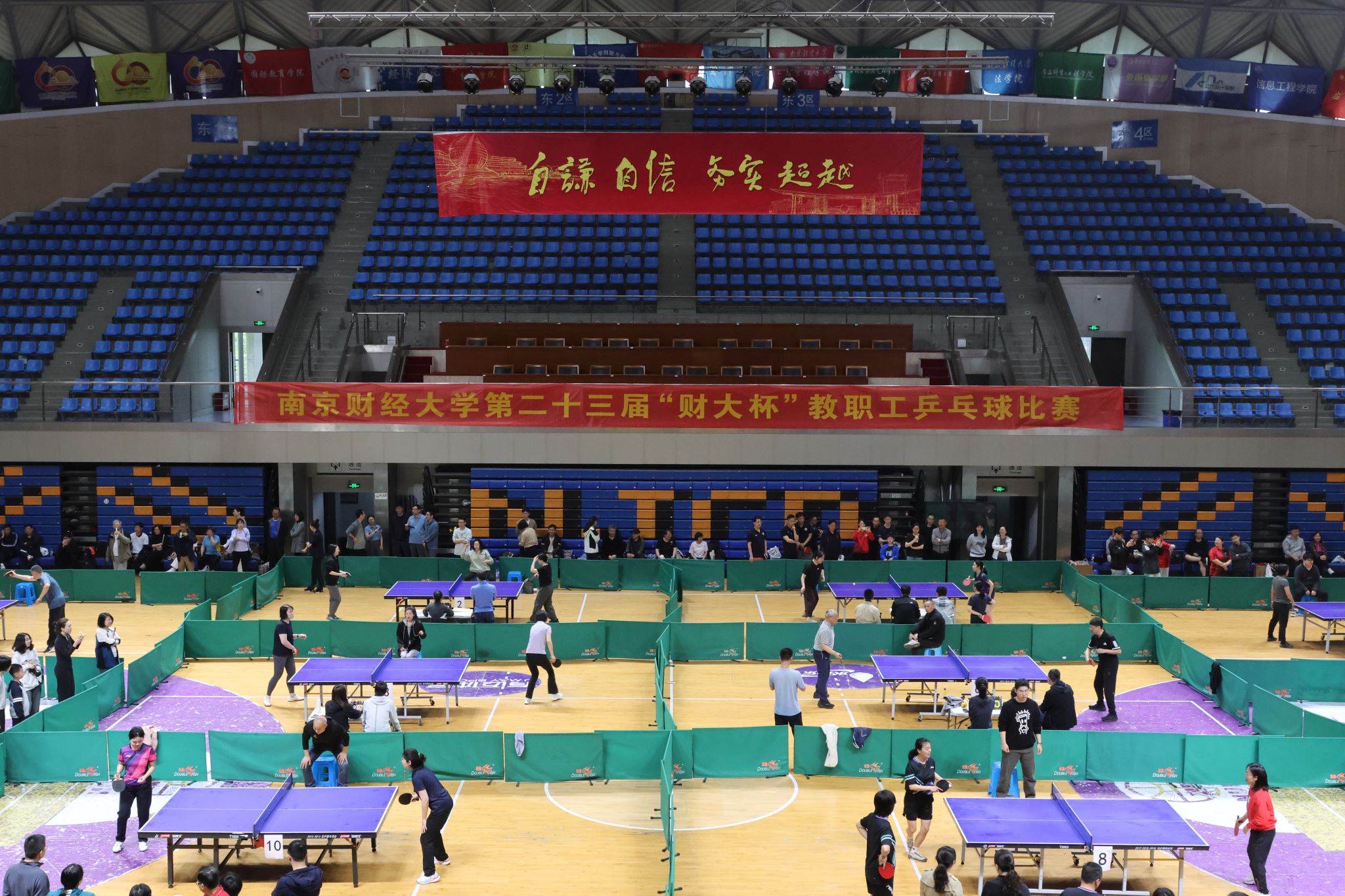 4月12日,由校工会、体育部主办的第二十三届“财大杯”教职工乒乓球比赛在仙林校区体育馆举行。包括校领导代表队在内的24支代表队近200名运动员参加比赛。校党委书记张利民代表校领导队出赛,并为其他运动员鼓劲加油。党委常委、副校长李煜出席开幕式。开闭幕式由校工会主席孙丹兵主持。