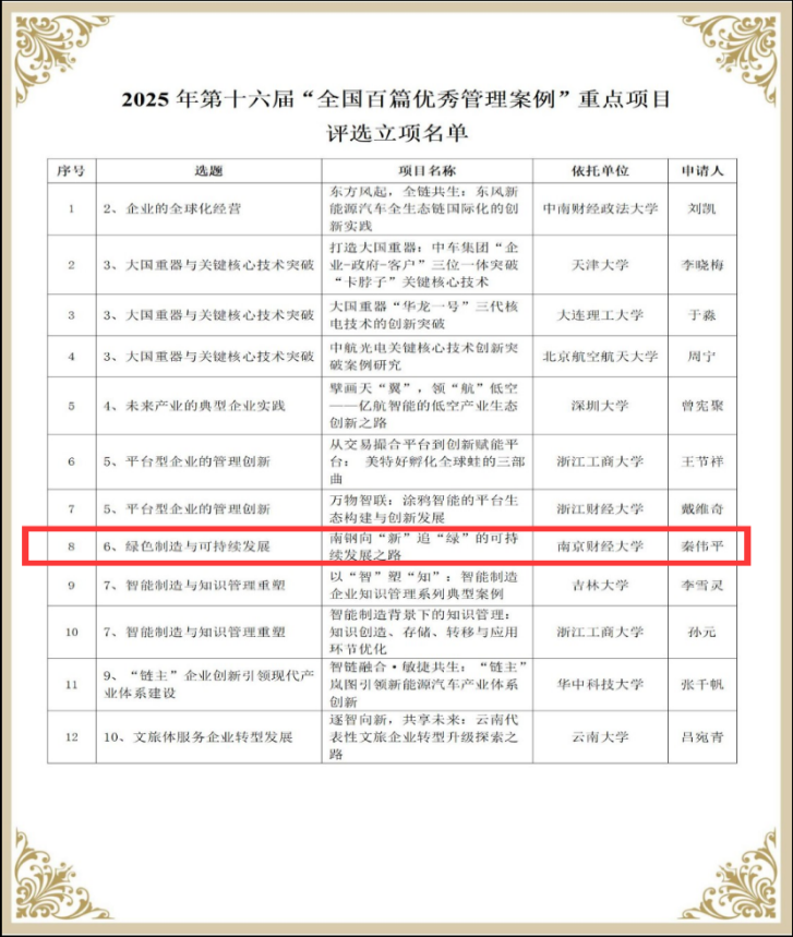 4月27日,由全国工商管理专业学位研究生教育指导委员会主办、中国管理案例共享中心负责组织的第十六届“全国百篇优秀管理案例”评选重点项目立项评审会在杭州召开。伟德官网MBA教育中心与管理科学与工程学院,联合工商管理学院、会计学院组建的跨学科团队申报的《南钢向“新”追“绿”的可持续发展之路》项目成功入选,在激烈角逐中实现伟德官网国家级案例重点项目零的突破。