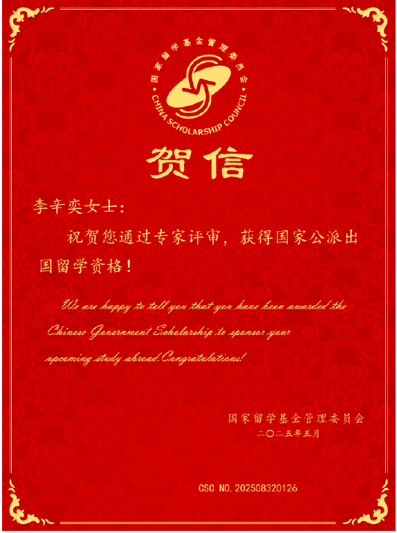 近日,国家留学基金管理委员会公布了2025年国家建设高水平大学公派研究生项目录取名单,伟德官网食品科学与工程学院2022级硕士研究生李辛奕凭借扎实的专业基础和突出的科研能力,成功入选该项目,即将前往全球食品科学与工程专业排名第五(2024年软科世界一流学科排名)的美国马萨诸塞大学阿默斯特分校攻读博士学位。