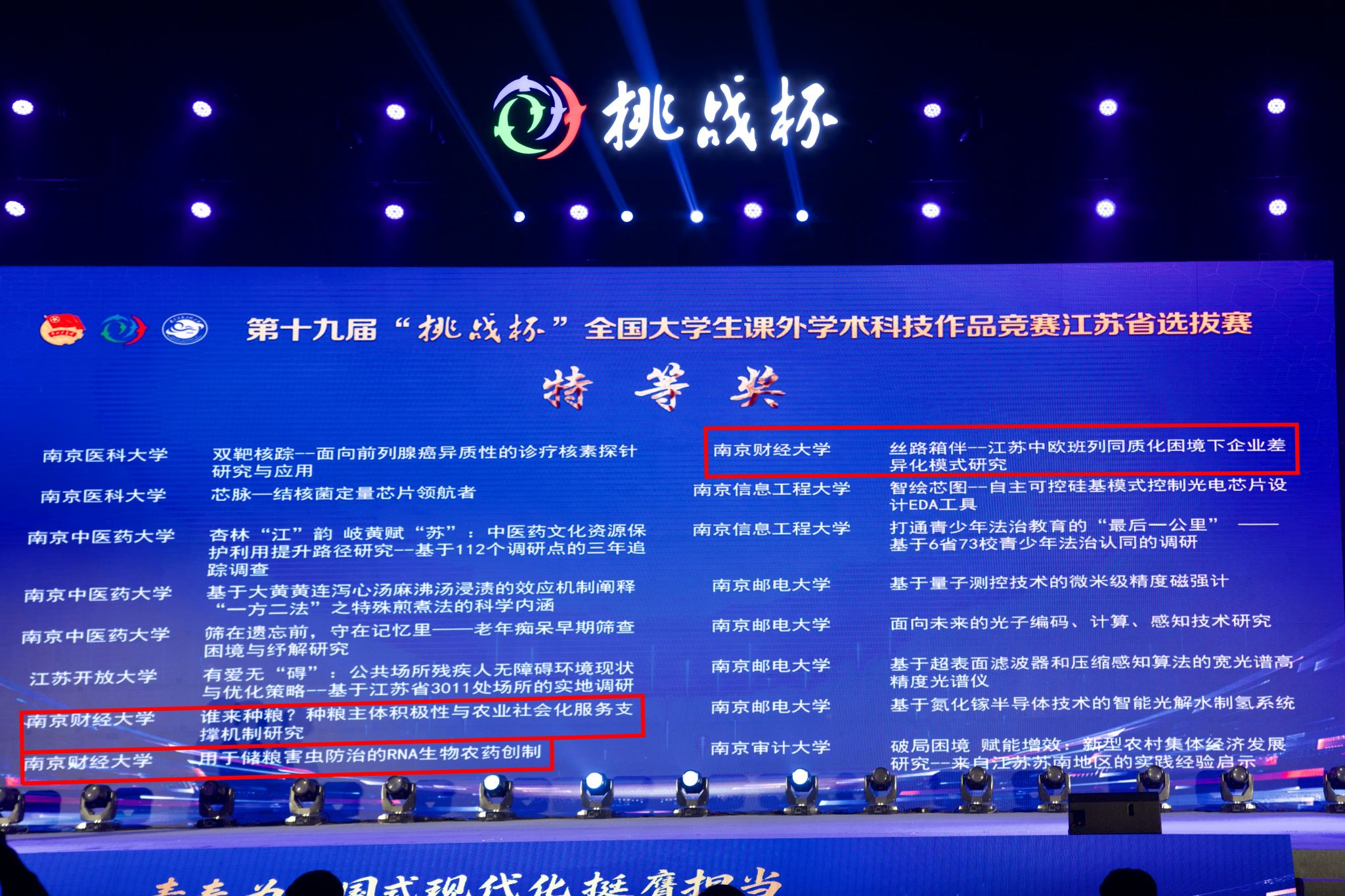 由经济学院选送的参赛作品《谁来种粮?种粮主体积极性与农业社会化服务支撑机制研究》、食品科学与工程学院选送的参赛作品《用于储粮害虫防治的RNA生物农药创制》、新闻与文化传播学院选送的参赛作品《丝路箱伴——江苏中欧班列同质化困境下企业差异化模式研究》荣获特等奖并入围国赛;由金融学院选送的参赛作品《小农“慧”种田:小农户如何拥抱智慧农业?——基于六省十五市的实地调查》荣获一等奖。
