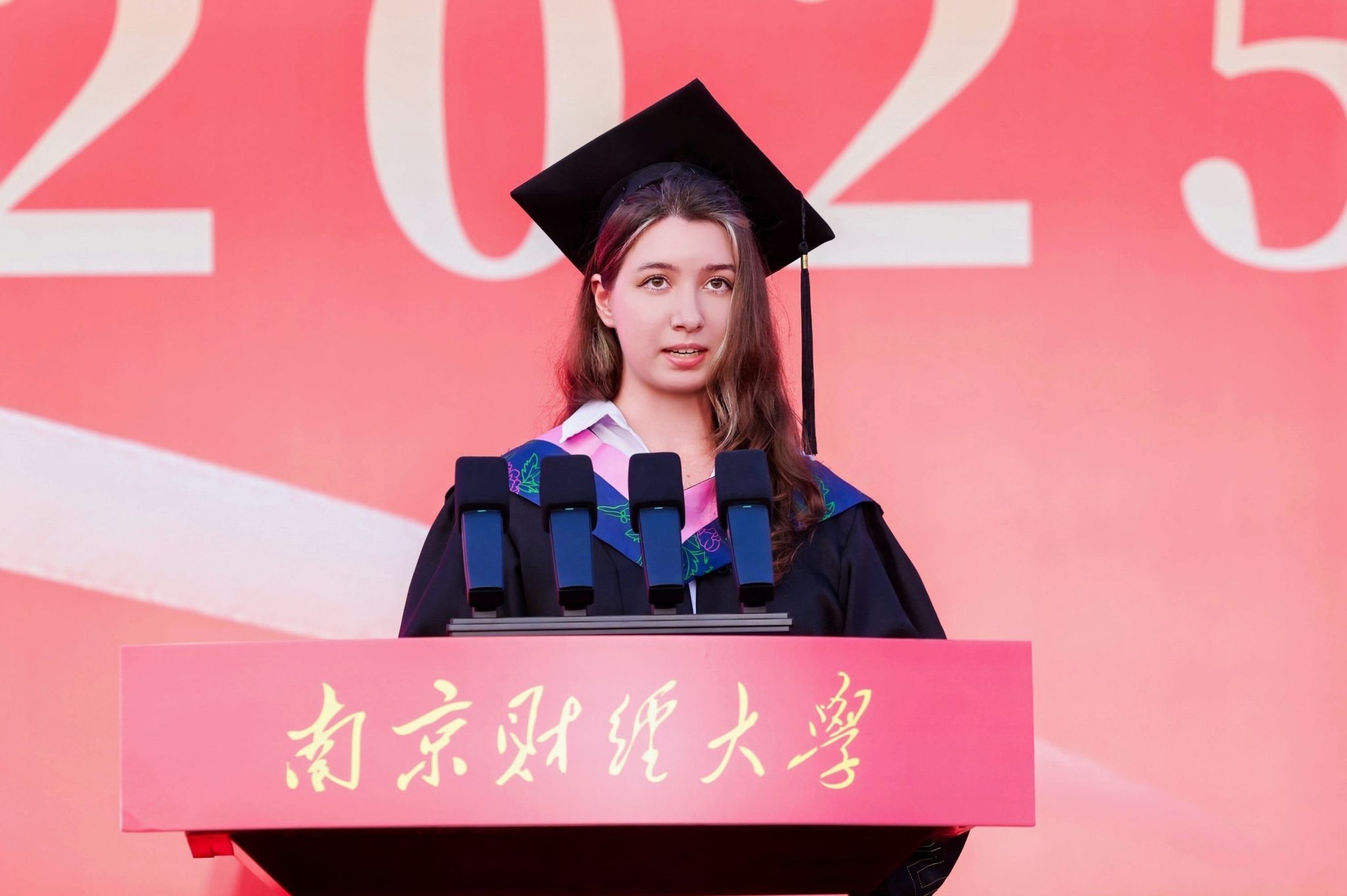外国留学生代表、国际教育学院伊莉娜同学发言,分享了南财求学旅途中的收获与感悟,表达了诚挚感谢和美好祝福。