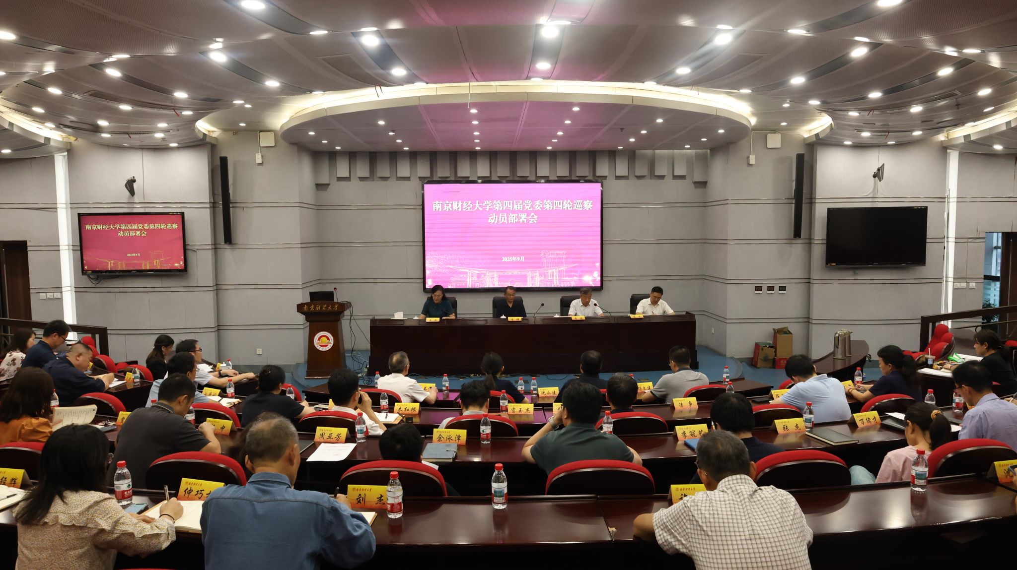9月18日下午,学校第四届党委第四轮巡察动员部署会在仙林校区行政楼二楼报告厅召开。校党委副书记、巡察工作领导小组副组长李群,纪检监察组组长、党委常委、纪委书记、巡察工作领导小组副组长李茜,党委常委、组织部部长、巡察工作领导小组成员吕戎,党委常委、宣传部部长、巡察工作领导小组成员朱军出席会议。被巡察单位党政领导班子成员、巡察组全体成员、巡察情况通报相关职能部门负责人和巡察办工作人员参加会议。会议由李茜组长主持。