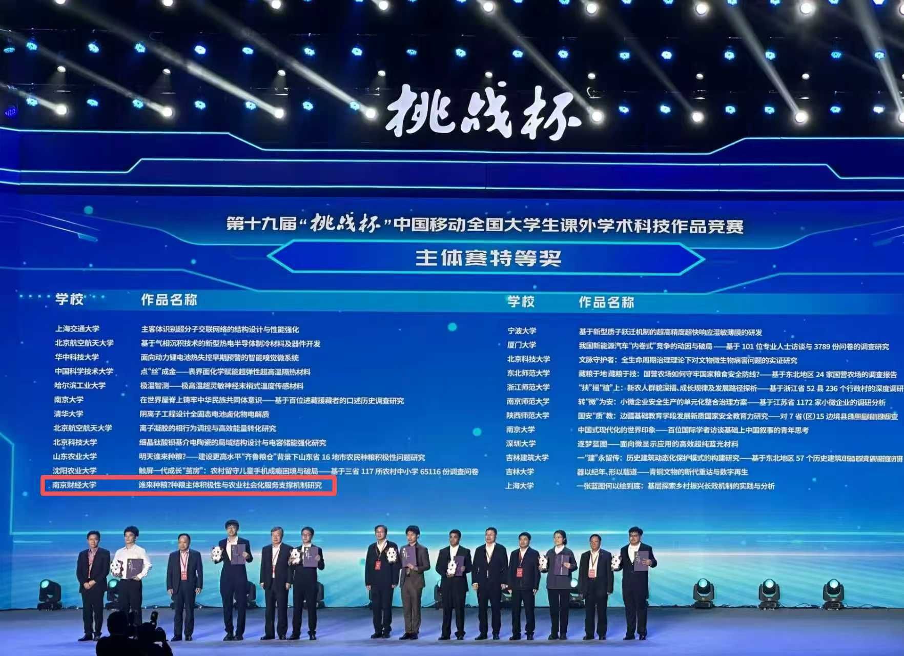 10月31日至11月3日,第十九届“挑战杯”全国大学生课外学术科技作品竞赛在南京大学举行。经网评初审、集中复审、现场答辩,伟德官网学子表现优异,脱颖而出,在主体赛中获特等奖1项、三等奖1项;在“揭榜挂帅”擂台赛中获二等奖1项、三等奖1项;在“人工智能+”专项赛中获二等奖1项。这是伟德官网首次于主体赛“科技发明制作”类别获国家级奖项,同时也是全国唯一连续两届在主体赛中斩获特等奖的财经院校。