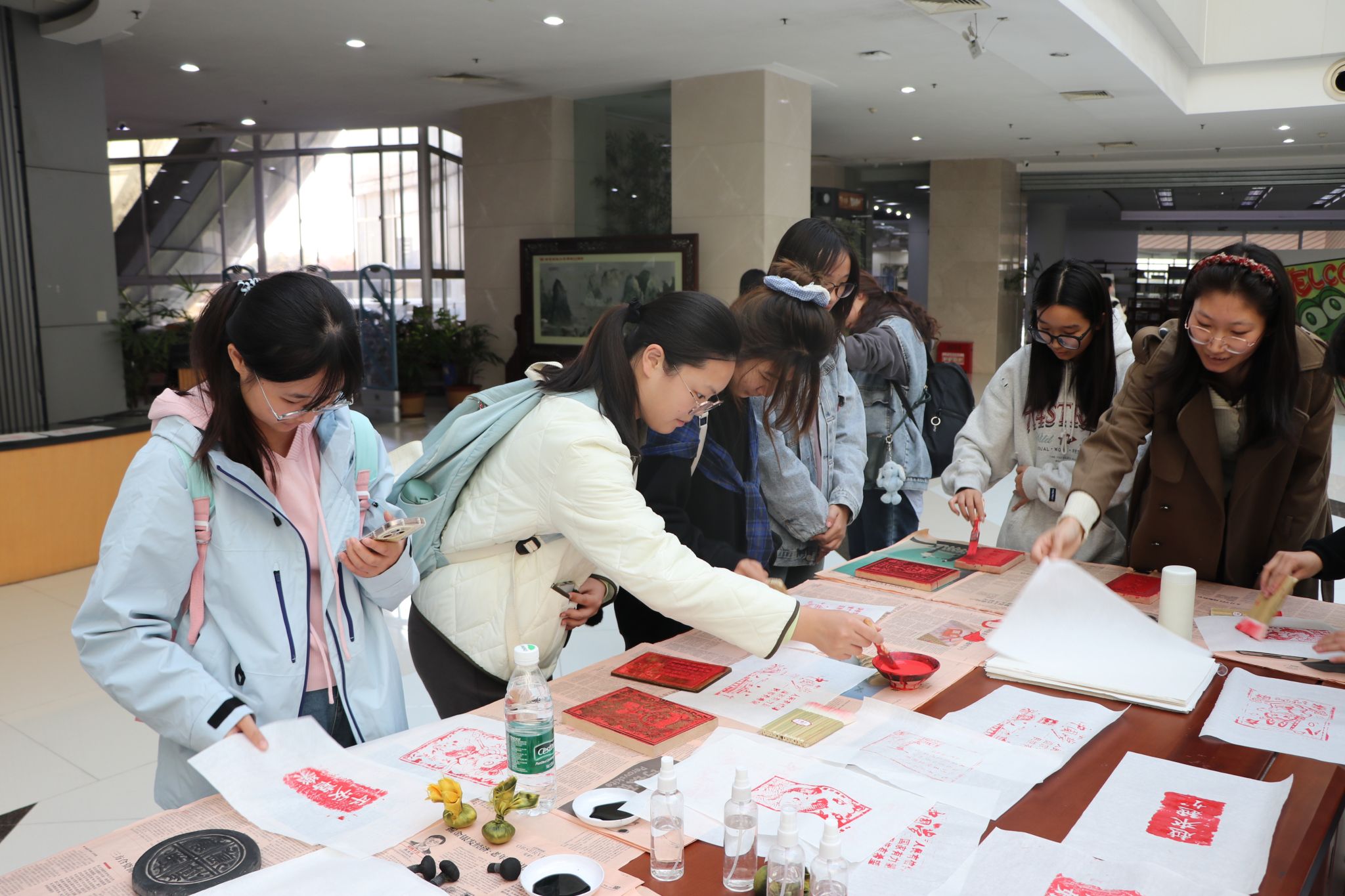 活动现场,中外文图书展在图书馆大厅举行,展览涵盖经济、管理、文学等学科领域。雕版印刷与瓦当拓印等非遗体验活动也吸引众多师生参与,大家通过亲手操作传统工具,感受千年技艺的魅力,在实践体验中增强文化认同感。