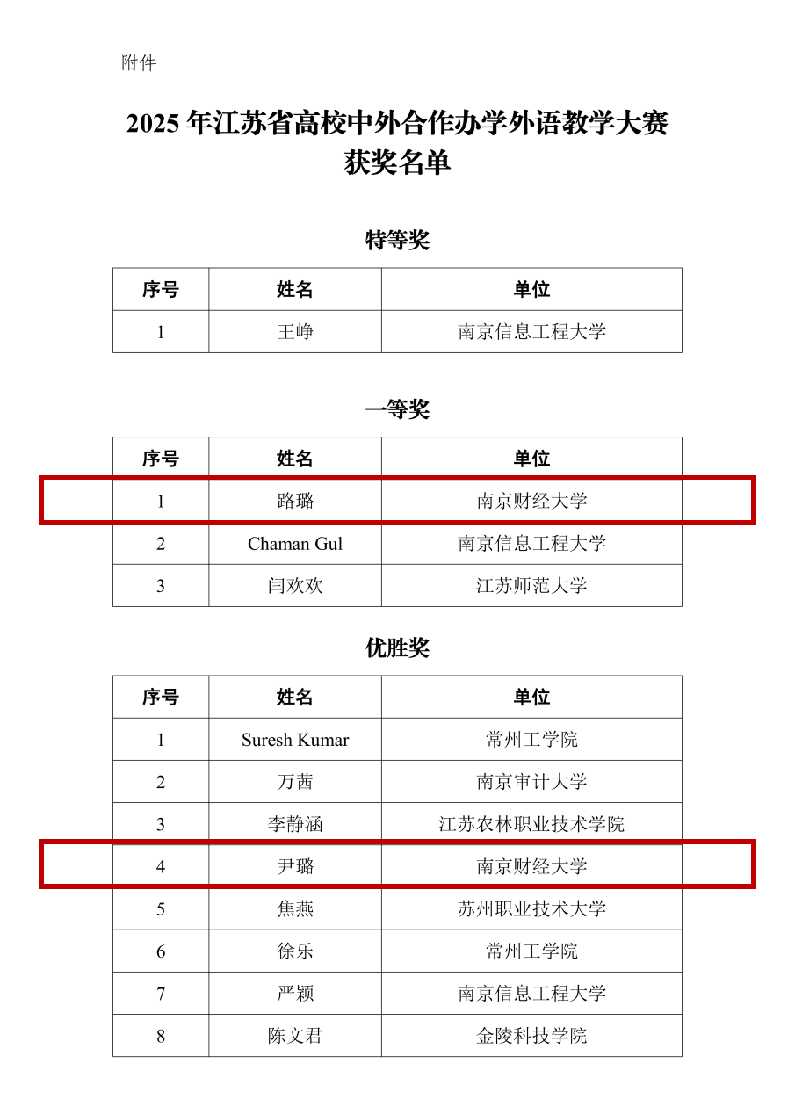 11月21日,由江苏省教育厅、江苏省高等教育学会指导,江苏省高等教育学会涉外办学研究委员会主办的江苏省高校中外合作办学外语教学大赛决赛圆满落幕。伟德官网梅西学院选送的新方课程中方主讲教师路璐(金融学院)、尹璐(公共管理学院)凭借扎实的教学功底、国际化的教学理念与精湛的外语授课能力脱颖而出,分别荣获一等奖与优胜奖。