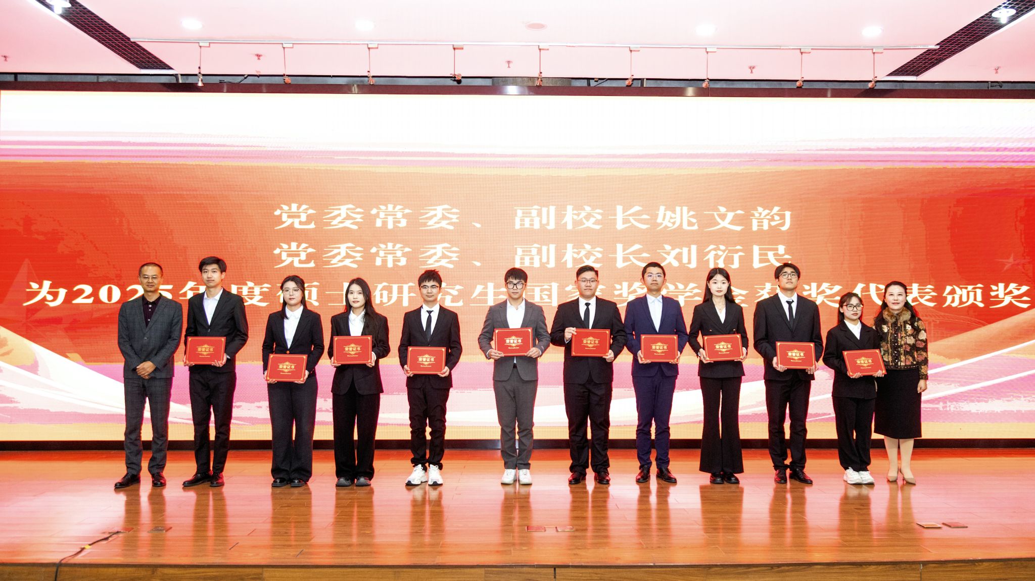 姚文韵副校长、刘衍民副校长为2025年度硕士研究生国家奖学金获奖代表颁奖