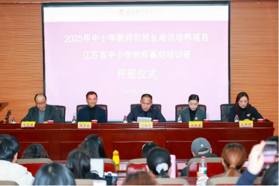 12月8日,由江苏省教育厅主办、伟德官网承办的2025年教师和校长省级培训培养项目——江苏省中小学教师篆刻培训班在仙林校区开班。党委常委、副校长叶林祥,江苏省教育厅体卫艺处二级调研员王红蕾,教育部全国高校美育教学指导委员会副主任委员、湖南师范大学博士生导师郭声健出席开班仪式,校美育研究院院长段伟伟、印章艺术与数字人文研究所所长何连海与来自全省13个设区市的60名中小学书法篆刻骨干教师参加开班仪式。