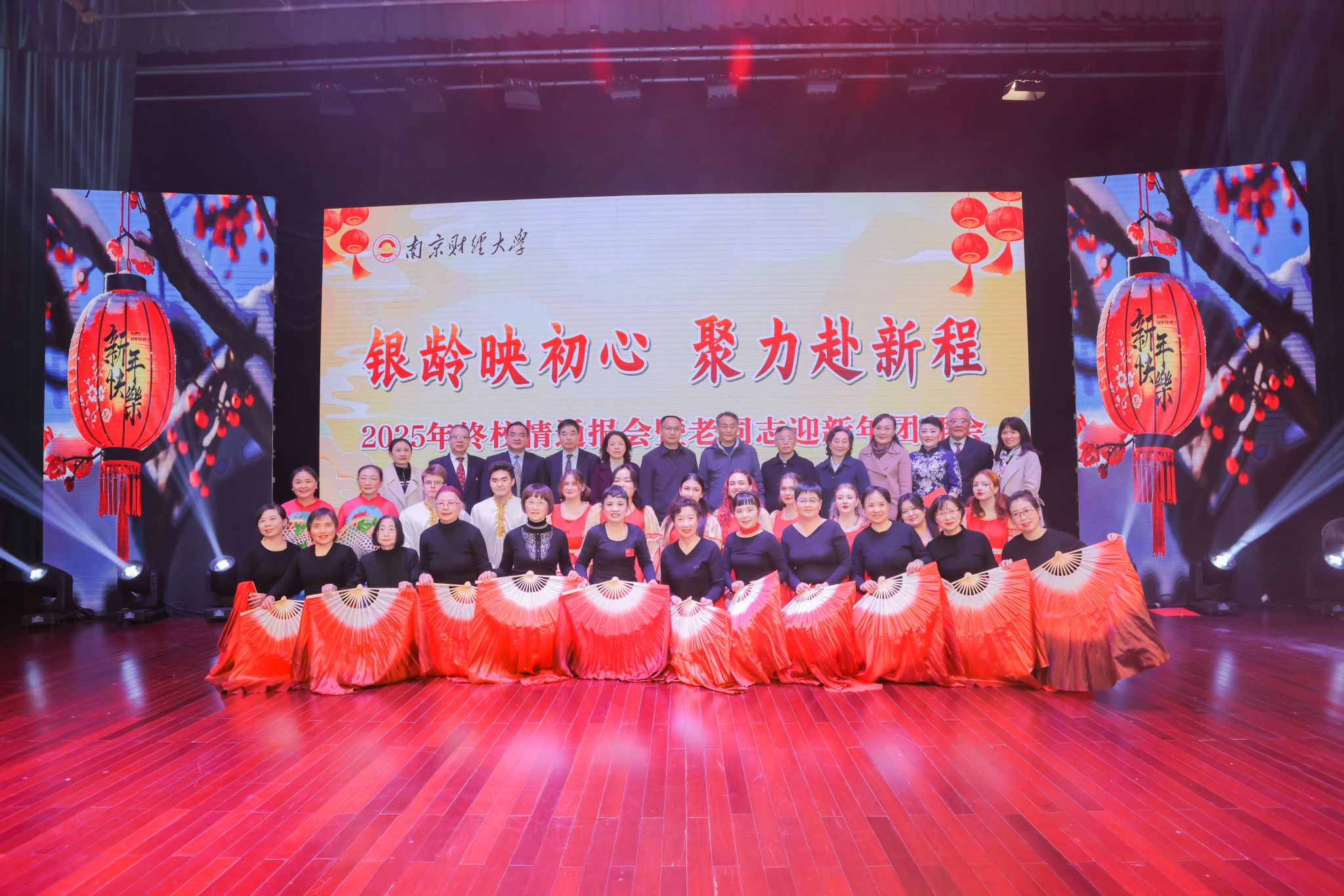 通报会结束后,迎新年团拜会文艺演出精彩启幕。开场歌舞《我和我的祖国》瞬间点燃现场氛围。由张从军教授创作的《南财赋》,经两位朗诵者深情演绎,回溯了学校办学历程中的奋斗足迹,引发全场共鸣。模舞《大鱼》以轻盈的步伐、别致的服饰,将老同志们的优雅风采展现得淋漓尽致。革命现代京剧《红灯记》选段,让现场观众感受红色精神的永恒魅力。国际教育学院留学生带来的俄罗斯舞蹈《热土长歌》极具异域风情,为演出增添了别样活力。压轴舞蹈《我爱你中国》将演出推向高潮,老同志们用舒展的舞姿、真挚的情感,礼赞新中国成立以来的辉煌成就,也表达了对学校未来发展的美好期许。