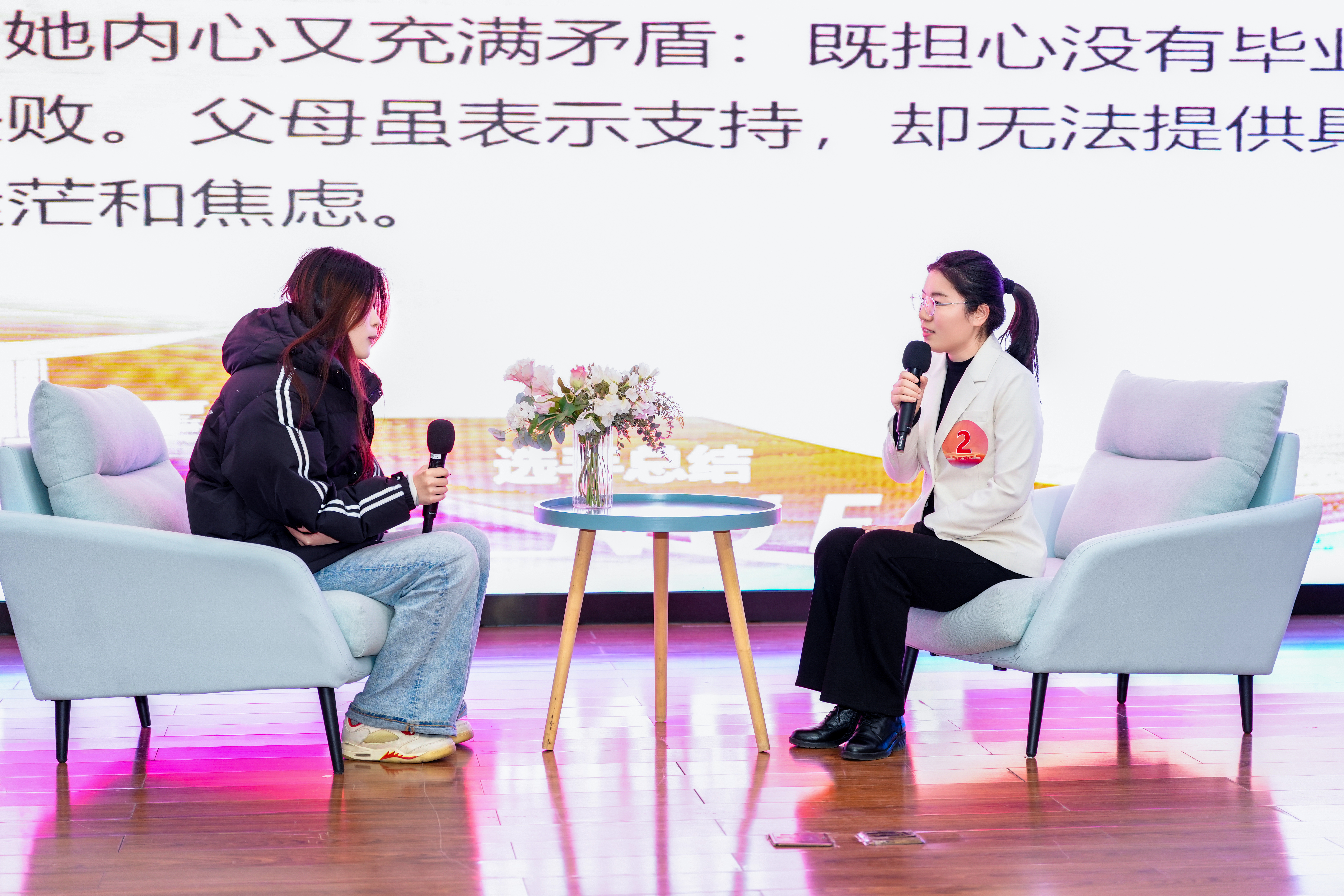 决赛现场,10名选手展开巅峰对决,各环节设计紧扣思政育人核心需求。案例研讨环节采用AB角互问互答模式,聚焦“AI工具使用”“网络舆论引导”“理想信念教育”“职业生涯规划中的价值引领”等高校思政工作典型场景。选手们从政策依据、理论支撑、实践路径三个维度剖析案例,提出“思政+专业”“线上+线下”等综合解决方案,展现出扎实的思政理论功底和灵活的实践应变能力。谈心谈话环节通过情景再现,还原学生在思想困惑、学业压力、宿舍矛盾、人际交往等方面的真实诉求,选手们以“先共情后引导、先倾听后施策”的沟通技巧,将思政教育融入暖心交流,既化解具体问题,又传递正确价值观,彰显了思政工作“润物无声”的育人艺术。南京师范大学学工部部长景飞在点评中表示,南财辅导员在比赛中展现出“理论与实践深度融合、价值引领与人文关怀有机统一”的能力特质,是新时代高校辅导员思政素养的生动体现。