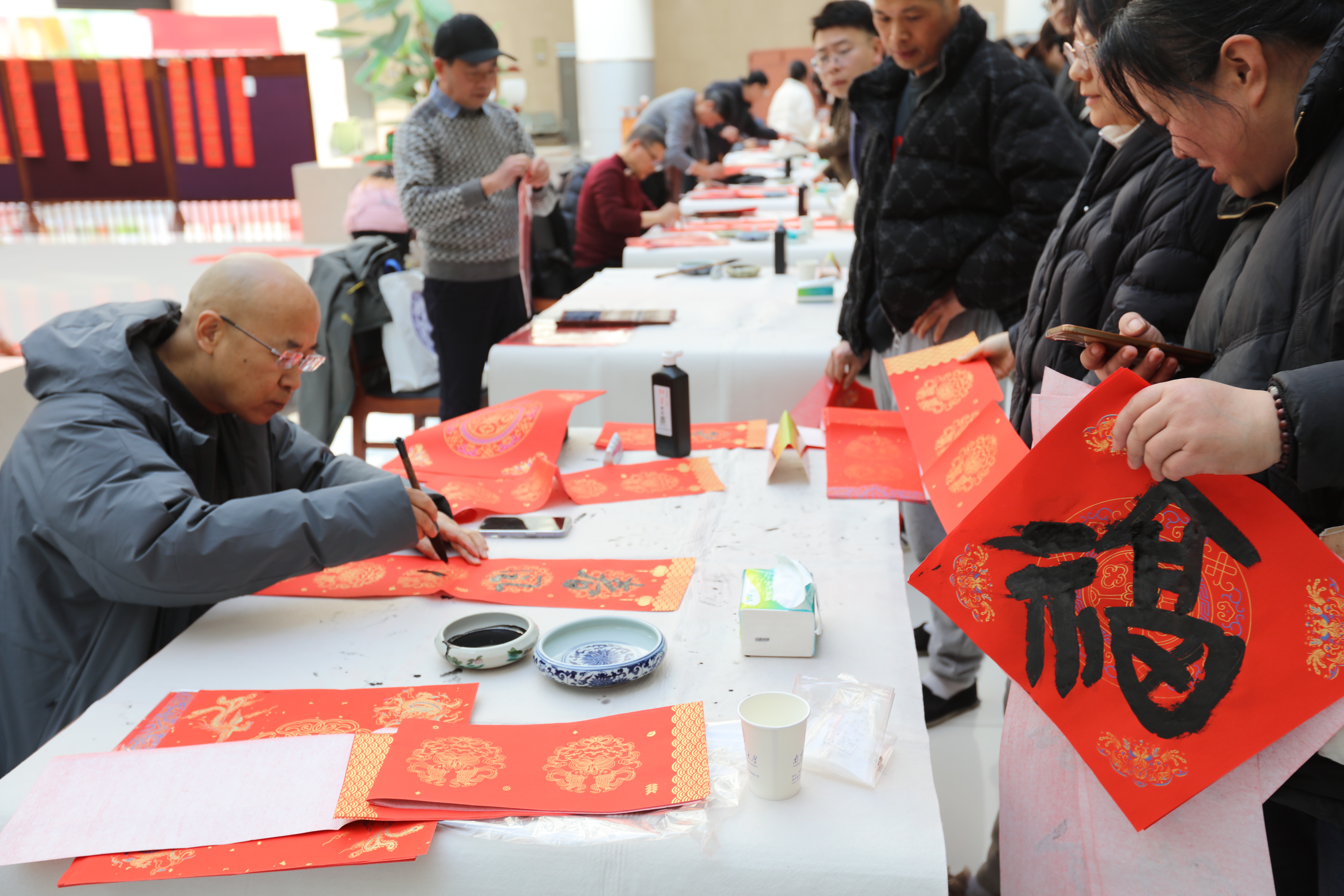 活动现场墨香四溢,喜气洋洋,校内外书法家和书法爱好者一起挥毫泼墨,为教职工书写春联和“福”字。一行行俊逸的书法、一句句真诚的祝福,寄托了辞旧迎新、接福纳祥的美好愿望。红纸翻飞、墨香流淌,一副副饱含年味、寓意吉祥的春联跃然纸上,一个个形态各异、笔力遒劲的“福”字摆满现场,将活动现场装点得红火热烈。