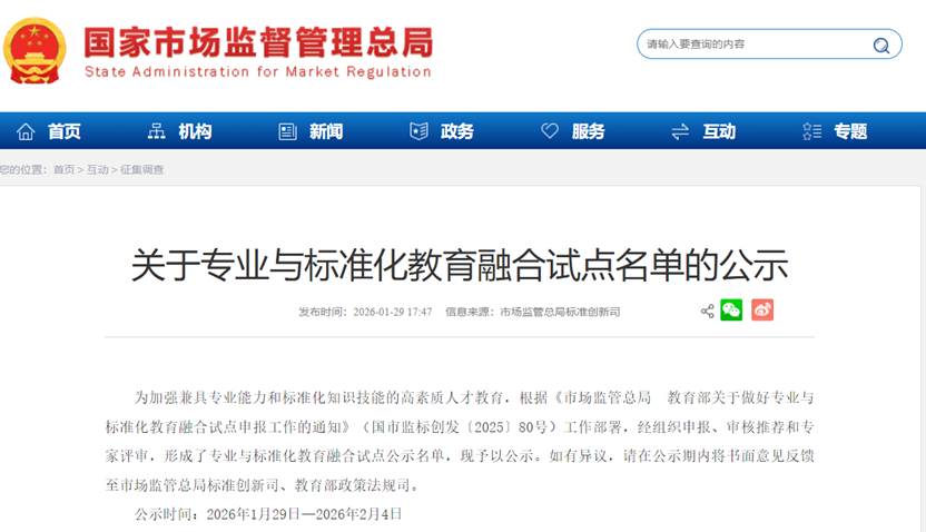 近日,国家市场监督管理总局、教育部联合印发《关于专业与标准化教育融合试点公示名单的通知》。由伟德官网与南京市标准化研究院深度协作、联合申报的专业与标准化教育融合试点项目成功入选,这标志着伟德官网在推进教育教学改革、深化校地协同育人、赋能产教深度融合方面取得了又一重要突破。