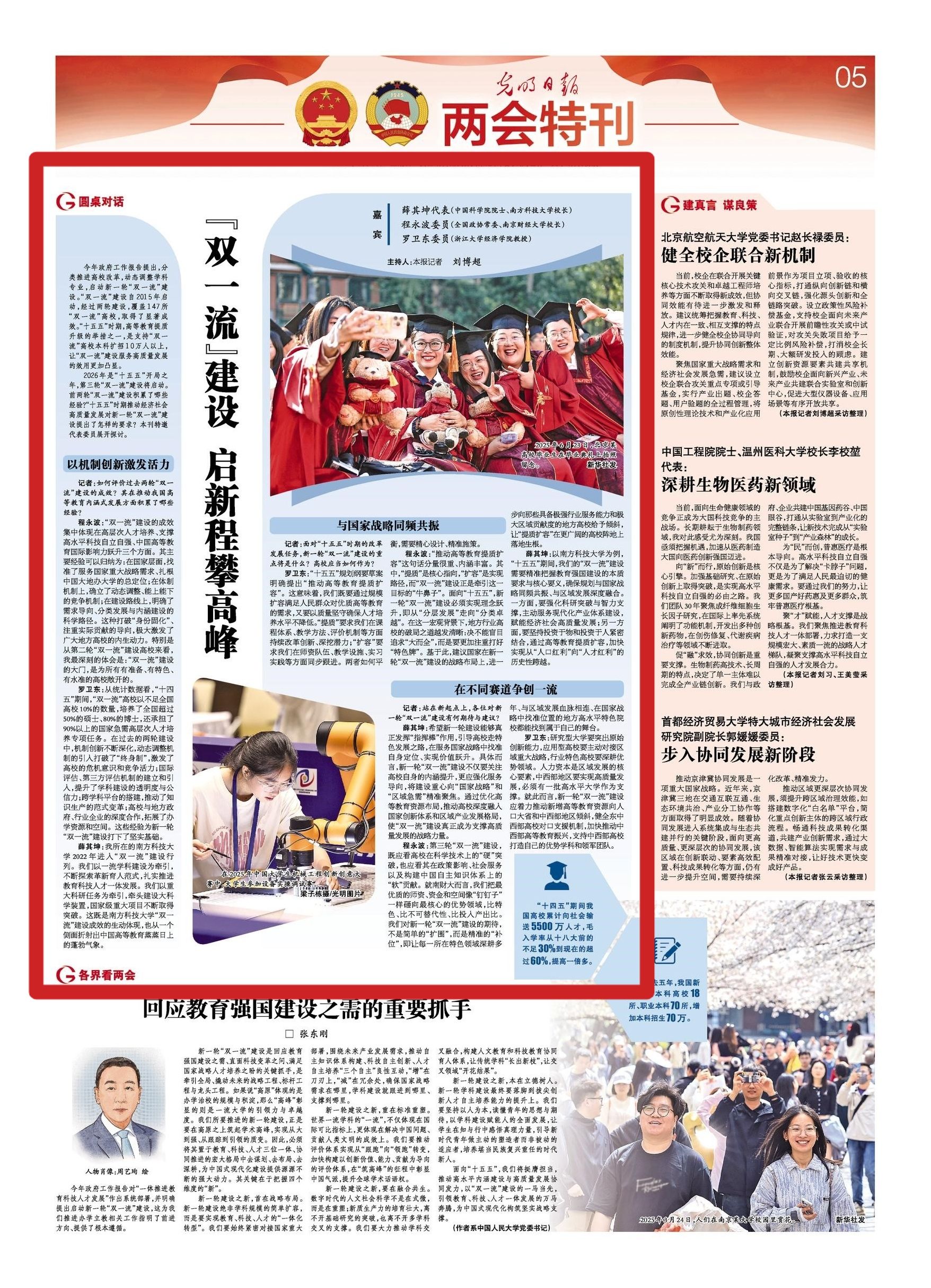 今年政府工作报告提出,分类推进高校改革,动态调整学科专业,启动新一轮“双一流”建设。“双一流”建设自2015年启动,经过两轮建设,覆盖147所“双一流”高校,取得了显著成效。“十五五”时期,高等教育提质升级的举措之一,是支持“双一流”高校本科扩招10万人以上,让“双一流”建设服务高质量发展的效用更加凸显。