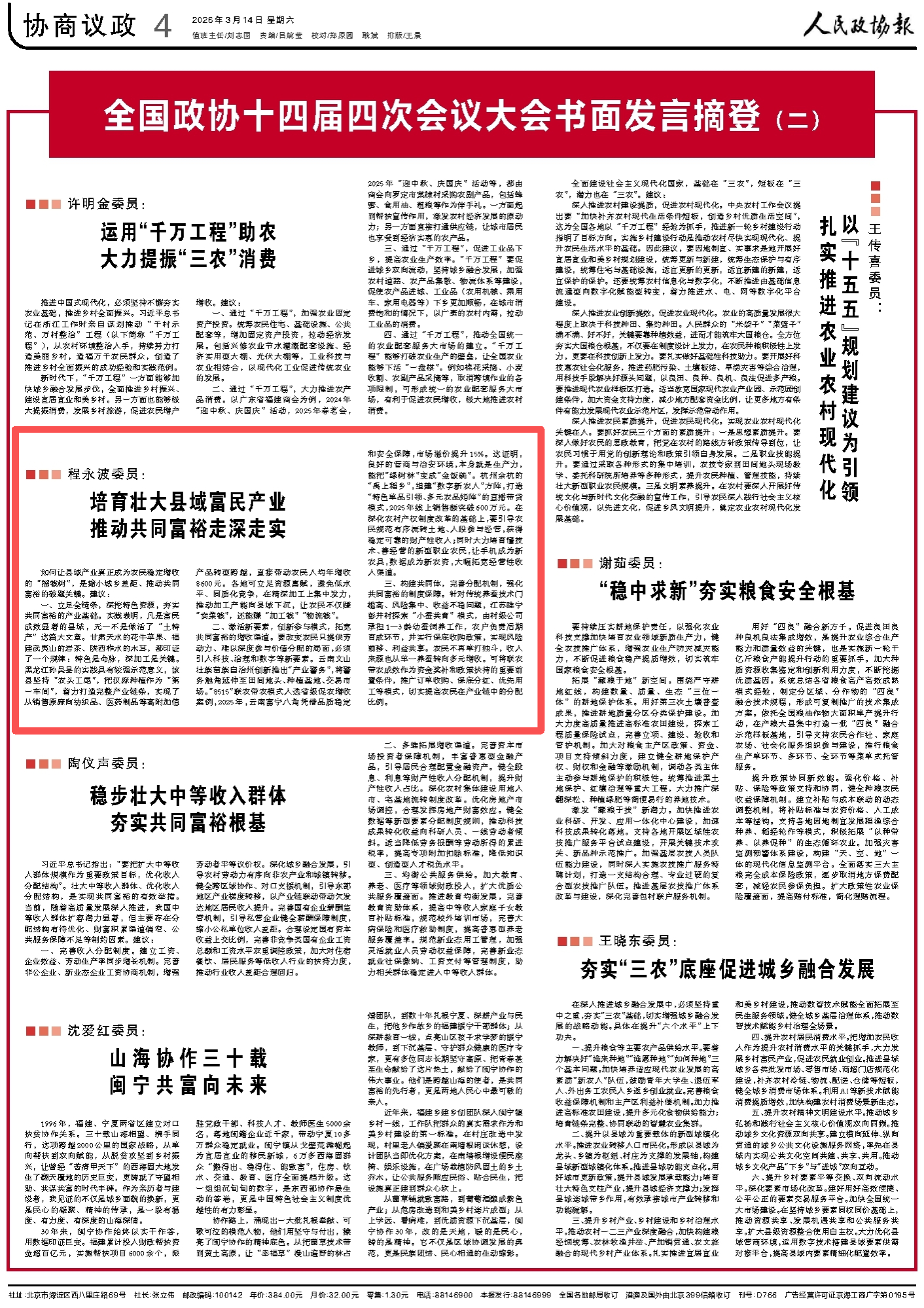 牢记职责勤履职,积极建言显担当。全国政协十四届四次会议收到委员们聚焦多个重点领域提交的大会口头发言和大会书面发言。3月14日,《人民政协报》摘登全国政协常委程永波校长在全国政协十四届四次会议大会上的书面发言《培育壮大县域富民产业 推动共同富裕走深走实》。