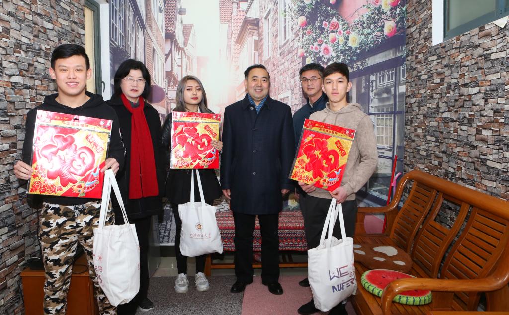 在看望慰问中,校领导与值班人员亲切握手,热情交谈,并送上了节日慰问品,感谢他们在寒假期间坚守岗位,为保障学校各项工作正常有序开展而辛勤工作、默默奉献。校领导一行还来到留学生宿舍看望了留校留学生,询问了他们春节在校期间的学习生活安排,向他们送上节日慰问品,并合影留念。