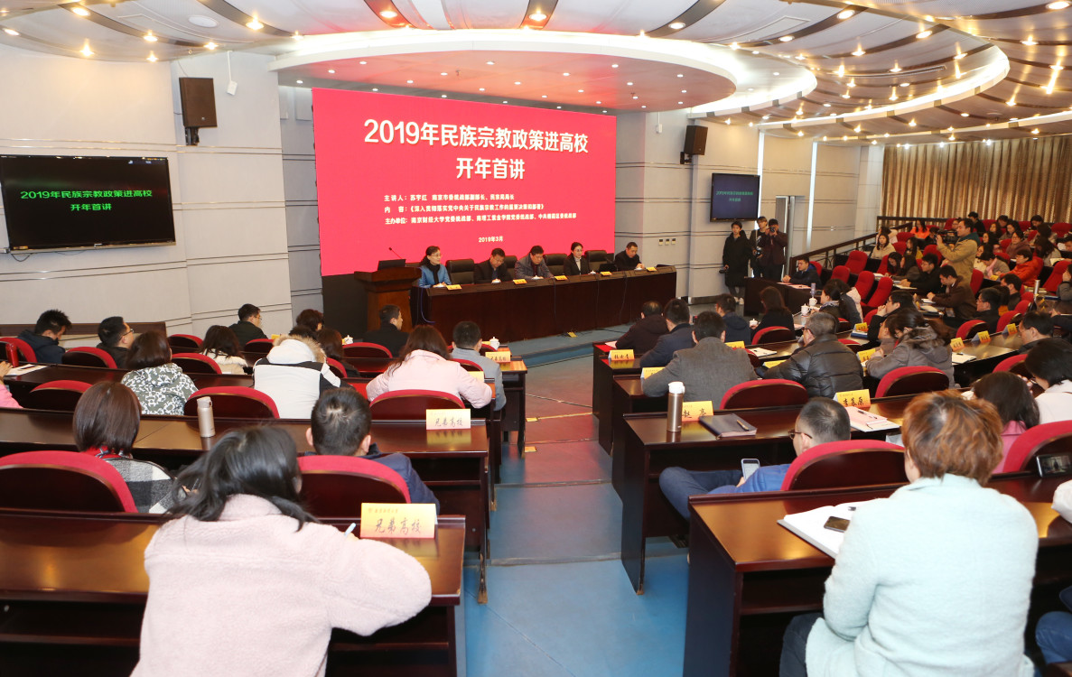 3月8日上午,伟德官网社会主义学院成立后的第一期培训——“2019年民族宗教政策进高校开年首讲活动”在仙林校区行政楼二楼报告厅举办。活动邀请了南京市委统战部副部长、市民族宗教事务局局长苏宇红做民族宗教政策解读。校党委副书记温潘亚出席活动并讲话。栖霞区委常委、统战部部长尹军,副区长袁文峰,民宗局局长盛艳等领导嘉宾出席活动。活动由校党委常委、统战部部长吕戎主持。