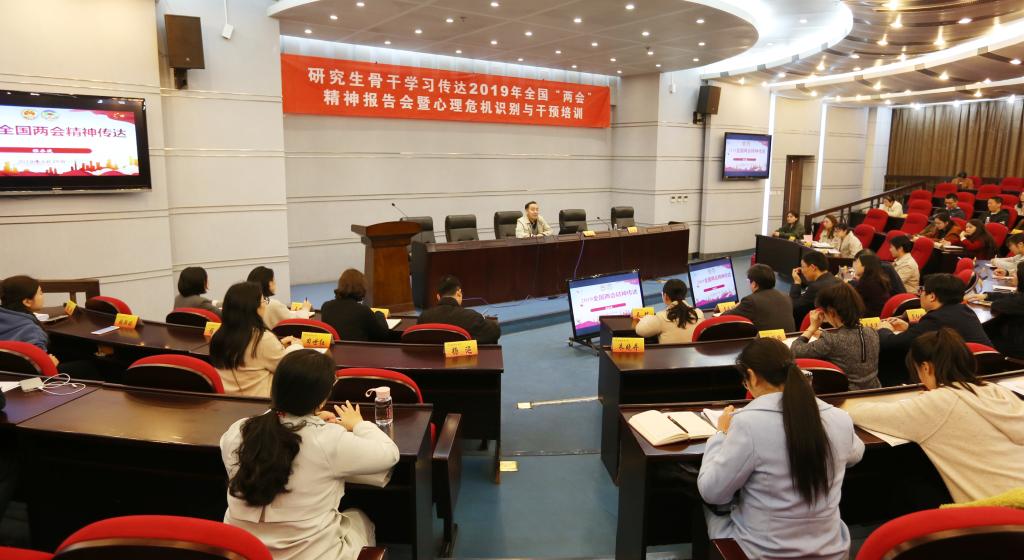 3月25日晚,伟德官网研究生骨干学习2019年全国两会精神报告会暨心理危机识别与干预培训在仙林校区行政楼二楼报告厅举办。全国政协委员、校长程永波应邀传达2019年全国两会精神。校院两级研究生会干部、全体研究生党支部书记、研究生团支部书记以及研究生秘书、研究生辅导员、党委研究生工作部、研究生院全体人员参加会议。会议由党委研究生工作部部长韩力争主持。