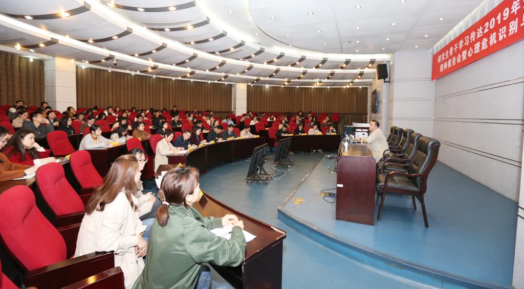 两会精神报告会后,心理健康教育与咨询中心主任吴垠作了心理危机识别与干预培训。她结合伟德官网2018年研究生心理健康普查的总体情况,介绍了研究生常见的心理问题及其调适,重点讲解了危害较高的精神障碍的种类及其干预措施。