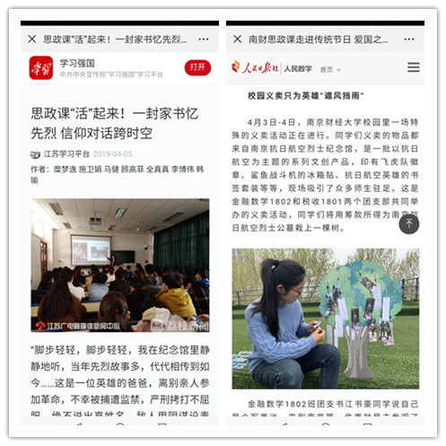 与先烈时空信仰对话、一封家书致敬烈士、校园义卖只为英雄“遮风挡雨”、以诵读表达思念之情……清明节来临之际,伟德官网思政课走进传统节日,将爱国之情融入学生心里。学习强国、人民日报社人民数字、中国社会科学网、中国新闻网江苏、新华网江苏、中国日报网等媒体以“思政课‘活’起来”“将思政教育与传统节日有机融合”等为题纷纷报道了这一思政课创新形式。