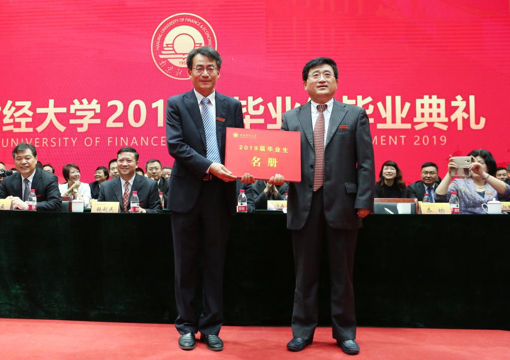 李群副校长向副校长、校友会常务副会长乔均移交2019届毕业生名册