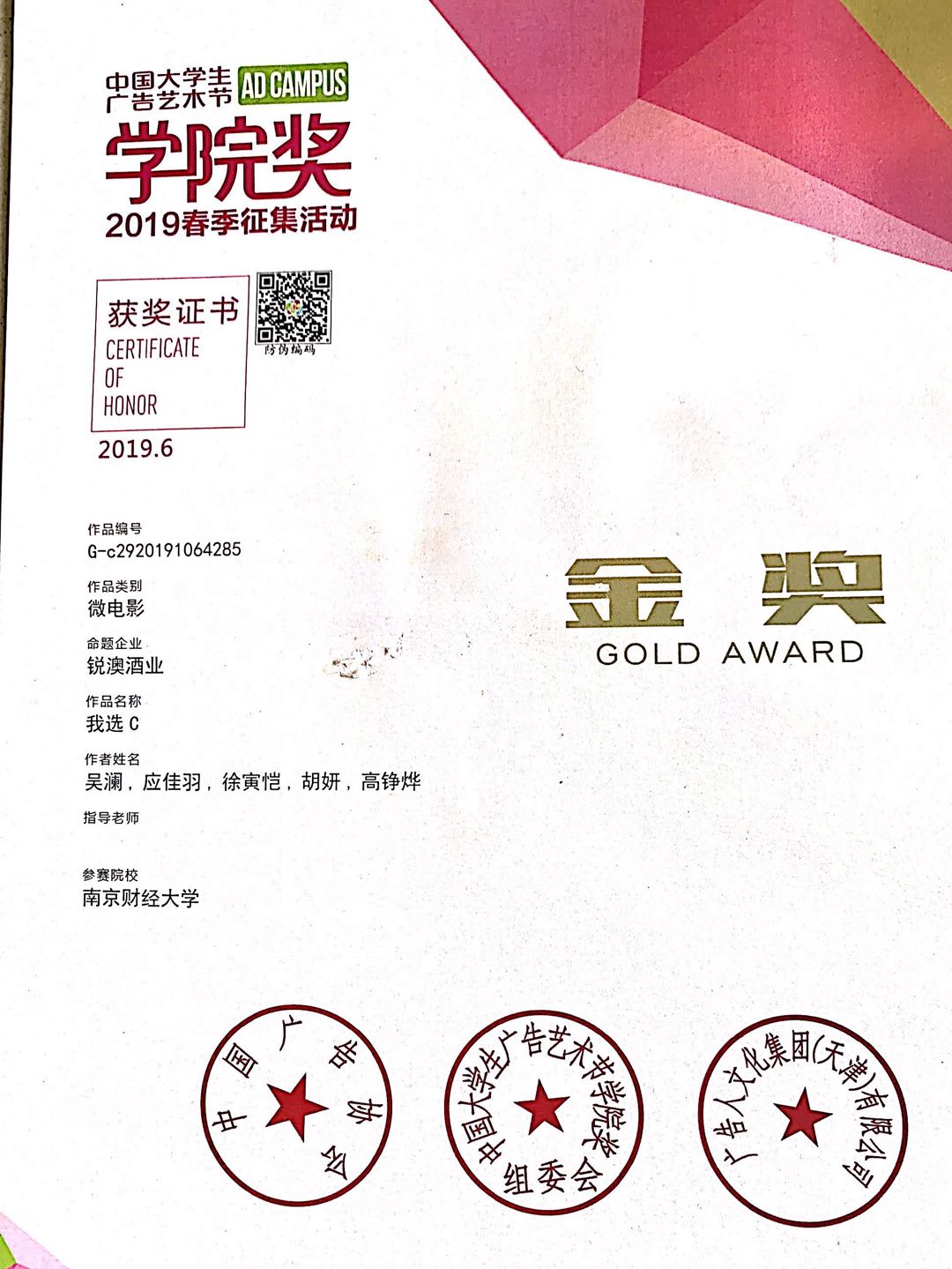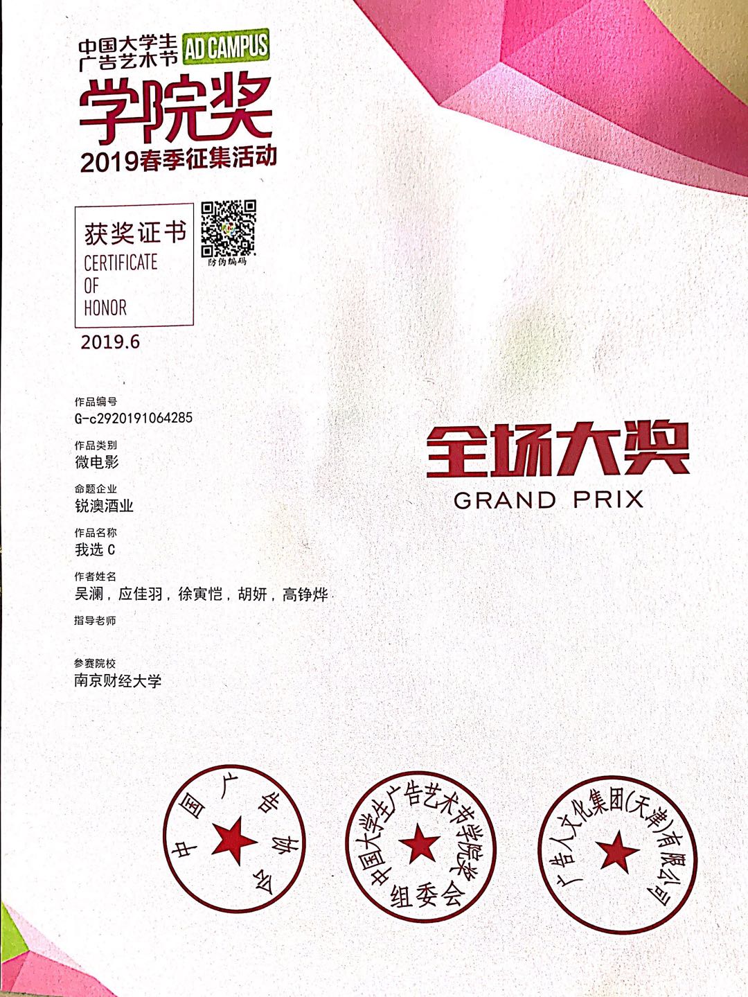 6月26日晚,中国大学生广告艺术节学院奖2019春季赛颁奖盛典在北京落下帷幕。伟德官网推荐的作品《微醺,是我与世界的和解》(参赛成员:吴澜、胡妍、应佳羽、高铮烨<新闻学院>,徐寅恺<艺术设计学院>)获得了锐澳酒业命题微电影类金奖,并与其他5组金奖比拼后最终脱颖而出,赢得了唯一的全场大奖,也是此项赛事的最高殊荣,并获得5万元奖励。
