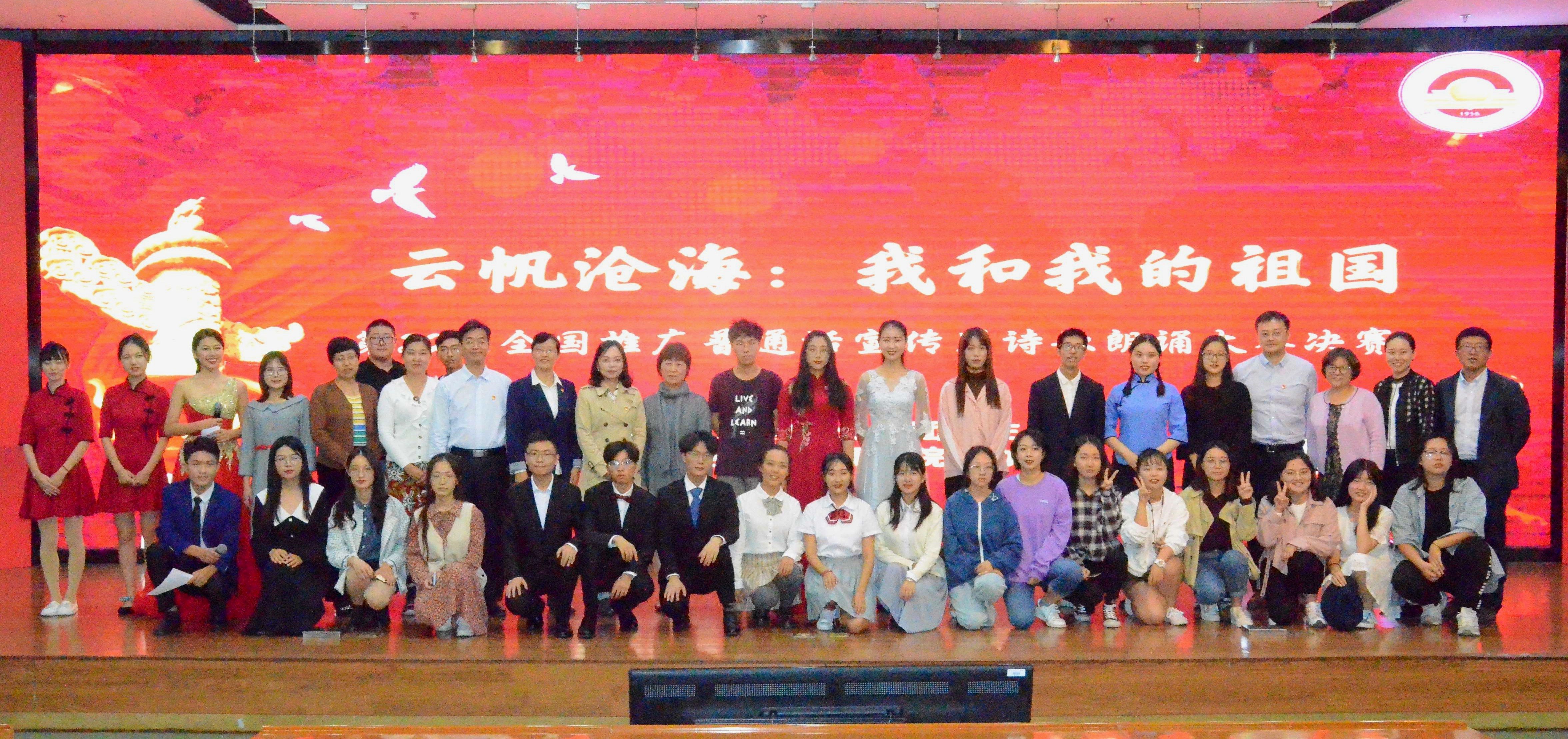 为促进普通话推广、深入实施中华经典诵读工程、大力弘扬爱国主义精神、培育社会主义核心价值观,10月11日下午,由教务处、校团委主办,新闻学院承办的“云帆沧海:我和我的祖国”第22届全国推广普通话宣传周诗歌朗诵大赛决赛在仙林校区图书馆一楼报告厅举行。校党委常委、副校长时现出席活动。相关职能部门领导、老师,来自11个学院和两个社团的16支团队共114名选手参加了活动。