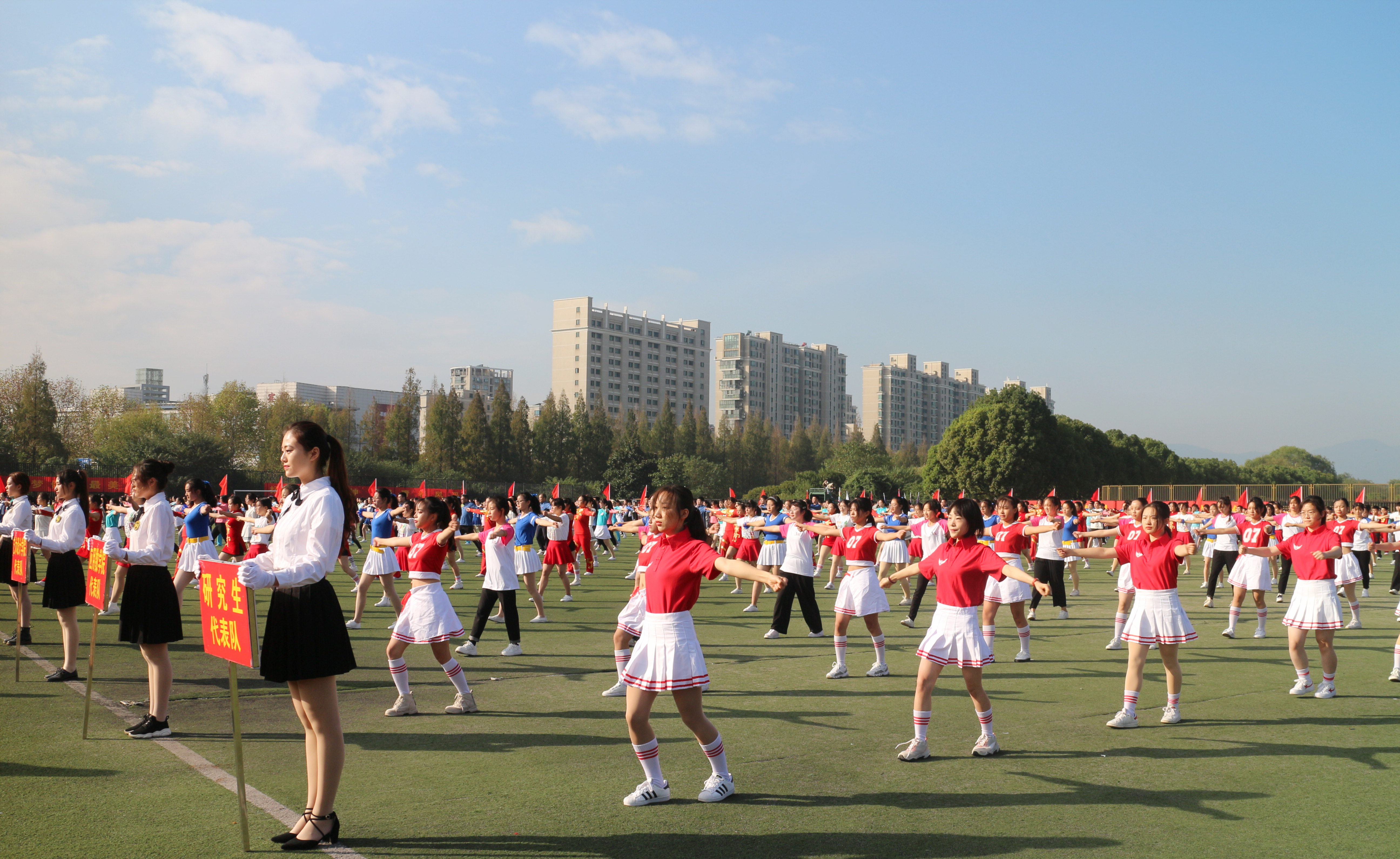 国歌奏响,国旗冉冉升起。伴随着校歌悠扬的旋律,校旗和运动会会旗缓缓升起,迎风招展。