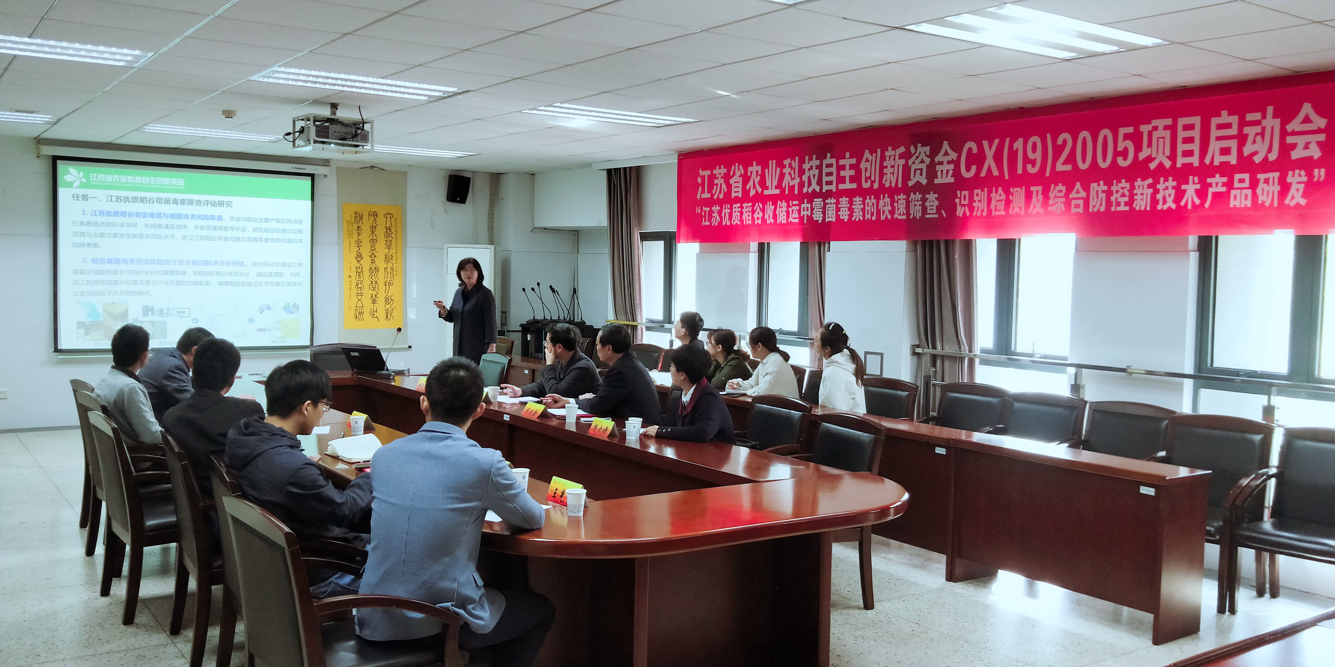 仪式结束后,江苏省农业科技自主创新资金CX(19)2005项目“江苏优质稻谷收储运中霉菌毒素的快速筛查、识别检测及综合防控新技术产品研发”启动会召开。会议邀请了南京农业大学食品科技学院教授屠康、江苏省农业科学院农产品研究所副所长李大婧、江苏省农垦米业集团有限公司董事长宗兆勤、江苏天勤会计师事务所副所长胡春才担任项目指导专家。邱伟芬副校长、校科研处、食品科学与工程学院相关领导及项目骨干成员参加了会议。会议由科研处副处长杨文建主持。