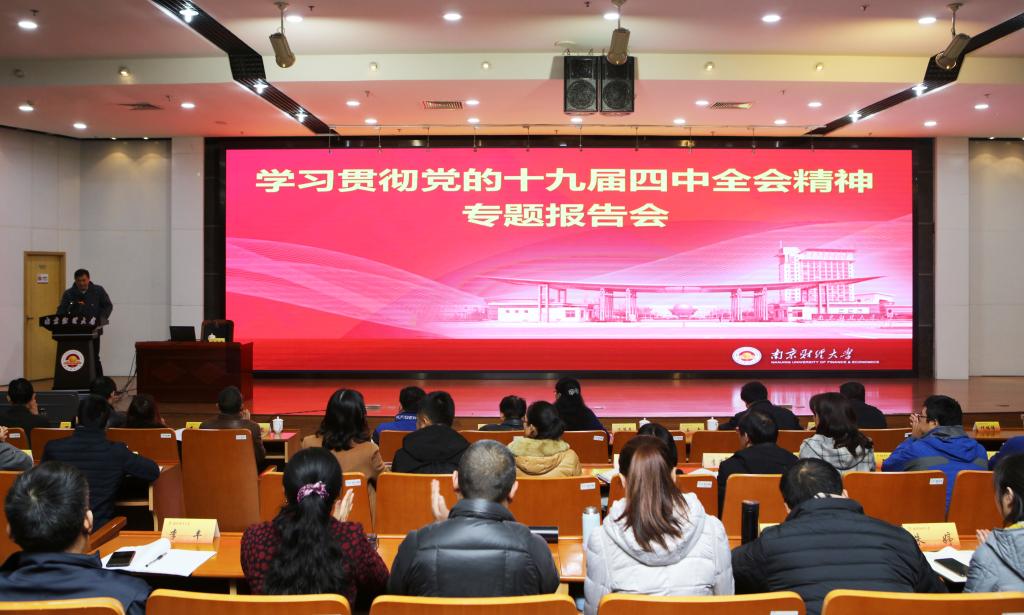 11月27日下午,伟德官网在仙林校区图书馆报告厅召开学习贯彻党的十九届四中全会精神专题报告会暨分组研讨会。全国政协委员、南京大学经济学院教授杨德才作“坚持和完善社会主义基本经济制度,推动经济高质量发展”专题报告。校党委副书记温潘亚出席并主持报告会,全体中层领导干部、全体基层党支部书记、党外人士代表、师生代表参加报告会。