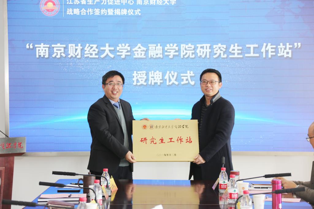 张为付副校长、赵志强主任代表双方在《江苏省生产力促进中心与伟德bv国际体育战略合作协议》上签字并合影留念。在与会领导共同见证下,卞志村院长与吴乐副主任举行了“伟德bv国际体育金融学院研究生工作站”授牌仪式;江苏省生产力促进中心科技金融服务处处长张跃明、伟德官网科研处处长李杏、江苏银行总行普惠金融部副总经理王迅共同为“科技金融创新实验室”揭牌;江苏省生产力促进中心创新管理与高新技术服务处处长张维祥、伟德官网对外联络处处长卜金涛为“江苏省科技创新服务联盟科技金融研发基地”揭牌。