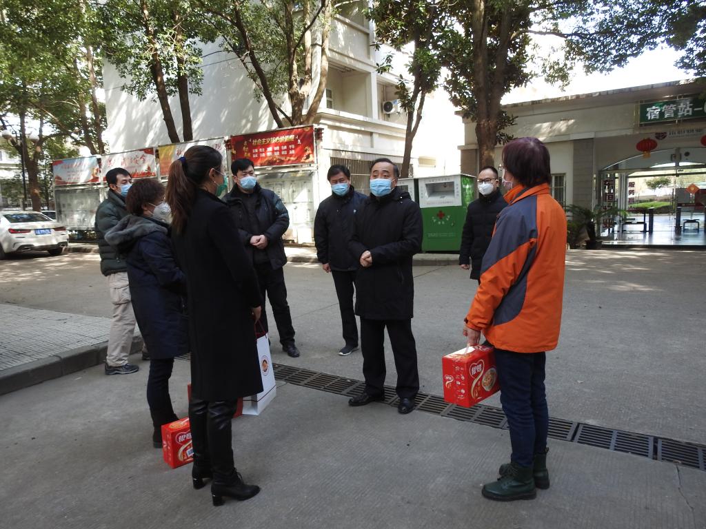 校领导先后来到仙林校区各门岗、校医院、宿管站和青教公寓等场所,与坚守岗位的疫情防控一线工作人员亲切交谈,详细了解各项防控措施落实情况和自我防护情况,对大家高度负责的工作态度表示充分肯定,并向大家的辛勤付出和无私奉献表示衷心感谢和诚挚问候。校领导向大家送上用学校专项党费购置的口罩、消毒液、方便面等防疫物资,叮嘱大家做好自身防护,继续扎实细致地开展好各项防控工作。校领导强调,要坚决贯彻落实好习近平总书记重要讲话精神和上级部门关于疫情防控的各项决策部署,坚定信心、同舟共济、科学防治、精准施策,共同打赢这场疫情防控阻击战。