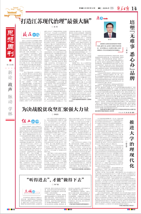 4月28日,《新华日报》思想周刊版刊发了校长程永波的署名文章《推进大学治理现代化》。文章指出,在中国高等教育勇攀世界一流之际,丰富并拓展大学治理现代化的内涵,从未来大学的发展需求来认清大学治理应该坚持和巩固什么,完善和发展什么,对于构建有中国特色的大学治理体系有着重要意义。坚持党在大学治理中的统领性,把服务中华民族伟大复兴作为大学的使命担当,着力彰显党对大学的全面领导,依照中国特色社会主义制度建设需求来展开对现代大学治理的探索。注重大学治理的融合性,大学需要突破传统的学科壁垒,改变传统的仅以学术论文、科研课题为评价标准的学术机构自说自话的状况,注重大学与企业、科研院所、政府的合作。淡化大学治理的经营性,尝试探索符合中国特色、符合学术组织特点的大学治理新路径。弘扬大学治理的本真性,从大学的章程入手审视大学的办学理念,理顺关系、培育文化,真正把对大学成就的认可引导到为真理的探索、为国家的富强、为人类的幸福上来。突出大学治理的创新性,创建多元化的新型参与合作路径,注重多类型基层教学组织、科研组织、服务组织的灵活创建,推行智能化大学治理,注重治理文化的创新。