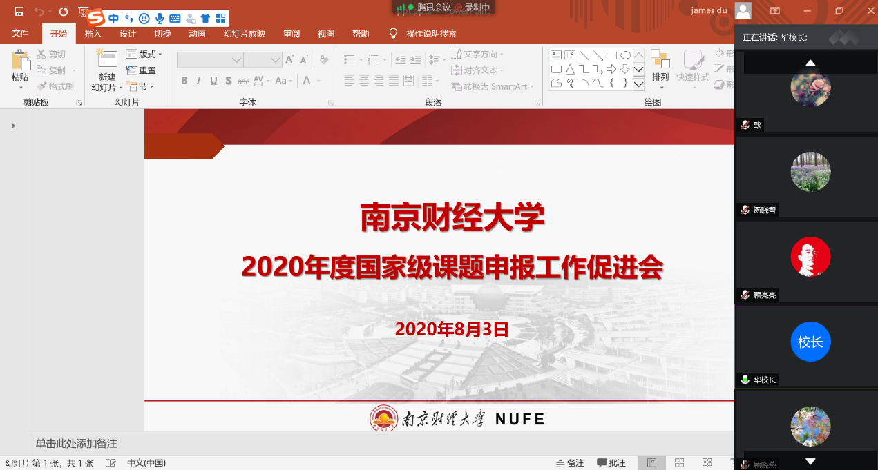 华仁海副校长讲话。他对各单位国家两基课题申报工作所作的努力给予了充分肯定。他强调,目前是国家自科和社科课题立项工作的关键时期,各学院(科研院)要全力以赴地抓好国家课题立项工作。他提出了三点意见:一是要进一步落实主体责任,做好国家级课题全过程跟踪服务,力促学校今年国家级课题申报取得好成绩,同时,要加强在研国家级课题的服务管理,提升在研课题的研究质量。二是要高度重视并协同谋划国家社科重大的申报工作。各学院院长和各学科带头人要在深入动员首席专家和课题成员积极申报的基础上,组织校内外专家论证,协调团队成员组建,为国家社科重大课题申报创造一切必要条件。三是加强对年轻教师的学术能力的培养,做好2021年度国家级课题申报启动工作。在2020年国家课题申报工作受疫情影响而有所推迟的情况下,各单位要充分利用暑期时间,开展申报人员的组织动员,项目选题的前期论证,青年教师科研方法与能力培训,提前做好2021年度国家级课题申报的前期准备工作。