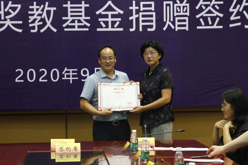 随后,蒋望董事长和裴银伟副处长、方勇副院长(主持工作)共同签署捐赠协议,邱伟芬副校长代表学校向蒋望董事长颁发了捐赠证书。