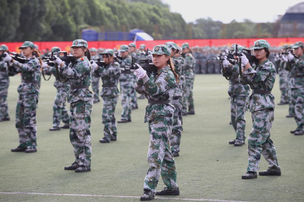 军训成果汇报大会上,在慷慨激昂的阅兵进行曲中,分列式方阵入场。他们昂首挺胸,朝气蓬勃,整齐紧凑的队形彰显了严明的纪律。军训科目表演中,1600余名新生不断变换队形,摆出箭头、十字路口、帆船、问号和五角星等图案,表达了对未来的憧憬、向前进的决心;临敌如游鱼戏水,出手似弹灰抛锤,男生的棍术豪迈有力,凸显男儿本色;女生的刺杀术气势如虹,展现巾帼英姿;女子军歌方阵入场,带来慷慨嘹亮的军歌表演;四起的硝烟中,分队战术方阵的出现将现场的气氛推向高潮,队员们沉着冷静,意志坚定,还原战场的紧张和危险,体现中国军人的英勇与热血。