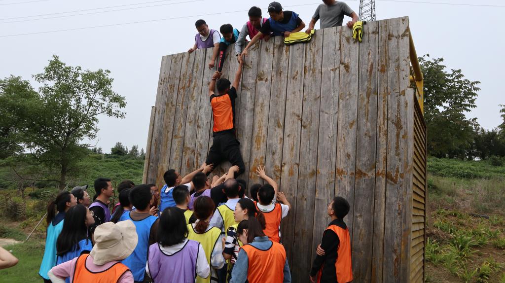 新进教职工在进行素质拓展项目之一——攀爬“毕业墙”