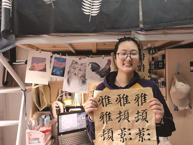 在宿舍的小天地里,伟德bv国际体育外国语学院2020级本科生张耀月临摹中国画、练习书法,不仅释放了压力,也收获了精神的成长。(学生供图)