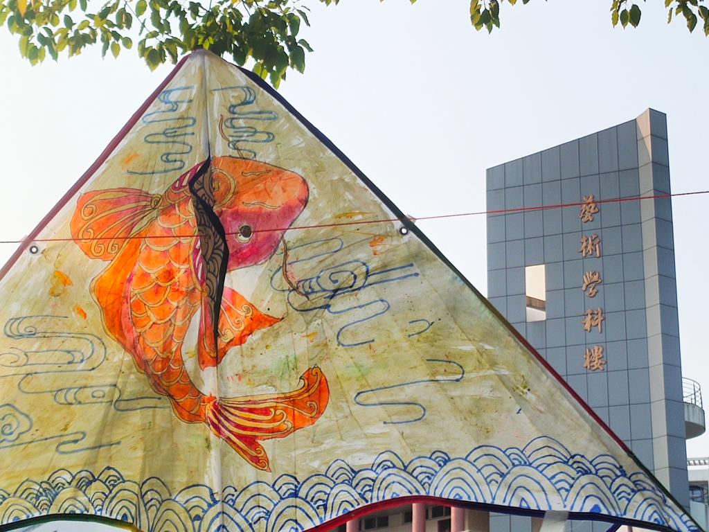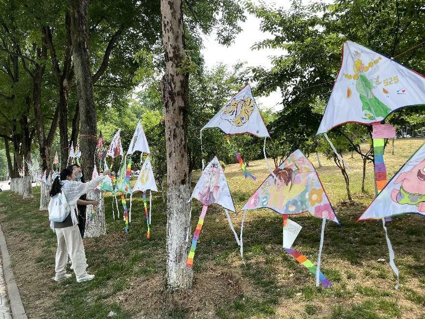 虎年花纹、南财元素、寓意幸运的鲤鱼、色彩鲜艳的花朵……同学们将风筝悬挂在艺术楼周围的主干道两旁,几十只各具风格的风筝随风飘动,在绿树下显得格外灵动,吸引着来往老师同学们驻足观看。环境2102班陈天堃同学协助悬挂风筝:“在封校时光里,偷闲放飞一只风筝,仿佛有了无拘无束的轻松感。”