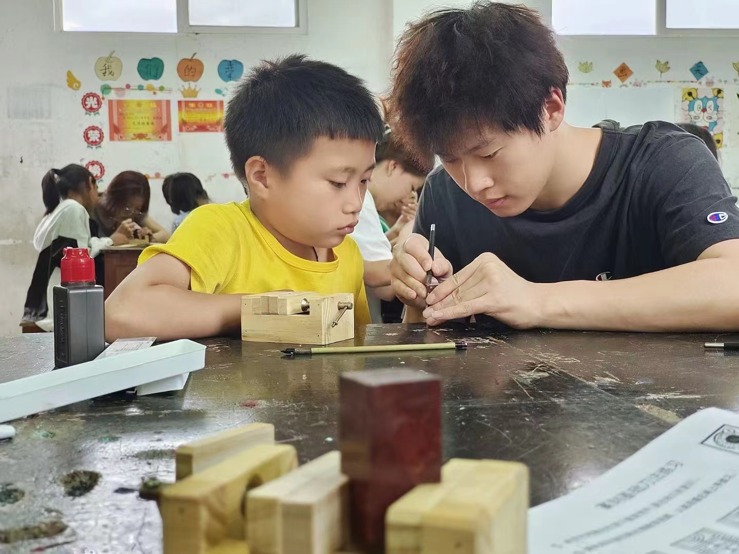 “篆刻好像是很古老的东西,我不太明白它的历史。”诗妤希望小学四年级同学白健平困惑地说道。在篆刻课程中,艺途童行支教队员们向孩子们展示了多种类型的篆刻作品,激发他们对篆刻的兴趣。随后,支教队员们从基础教学开始,引领孩子们开展单字印篆刻、生肖篆刻,孩子们则充分发挥自己的想象力,用刻刀雕刻着属于自己的小天地。他们将自己的心血和灵感融入独一无二的作品之中,感受着传统文化的独特魅力。