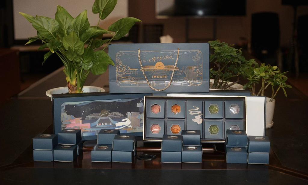 在艺术设计学院“新生 新升 新声”迎新现场,学院贴心地为报到的同学们准备了新生大礼包。其中,“送你一盒南财的月光”月饼吸引了萌新们的驻足,这是特意为绿色通道的受资助同学准备的月饼。早在暑假期间,由艺术设计学院陈帅杰同学、谢远菁同学带领的月饼文创团队就忙碌了起来。“送你一盒南财的月光”月饼将南财特色建筑与广式月饼相结合,采用八角外形,寓意吉祥、完整、幸福、长寿和健康;饼面的南财建筑采用了立体浮雕开模技术,更好地展现建筑的立体感,整体精致且饱满。创业团队自主联系食品加工厂,全程监控食材的选择和加工的细节,进行生产和包装。“马上就到中秋节了,趁着迎新,我们给同学们准备了定制的月饼。希望第一次离家的同学们开学的第一天能在南财感受到家一样的温暖,也希望他们能因此开启他们‘圆满’的大学生活。”艺术设计学院党委副书记张荣霞说道。