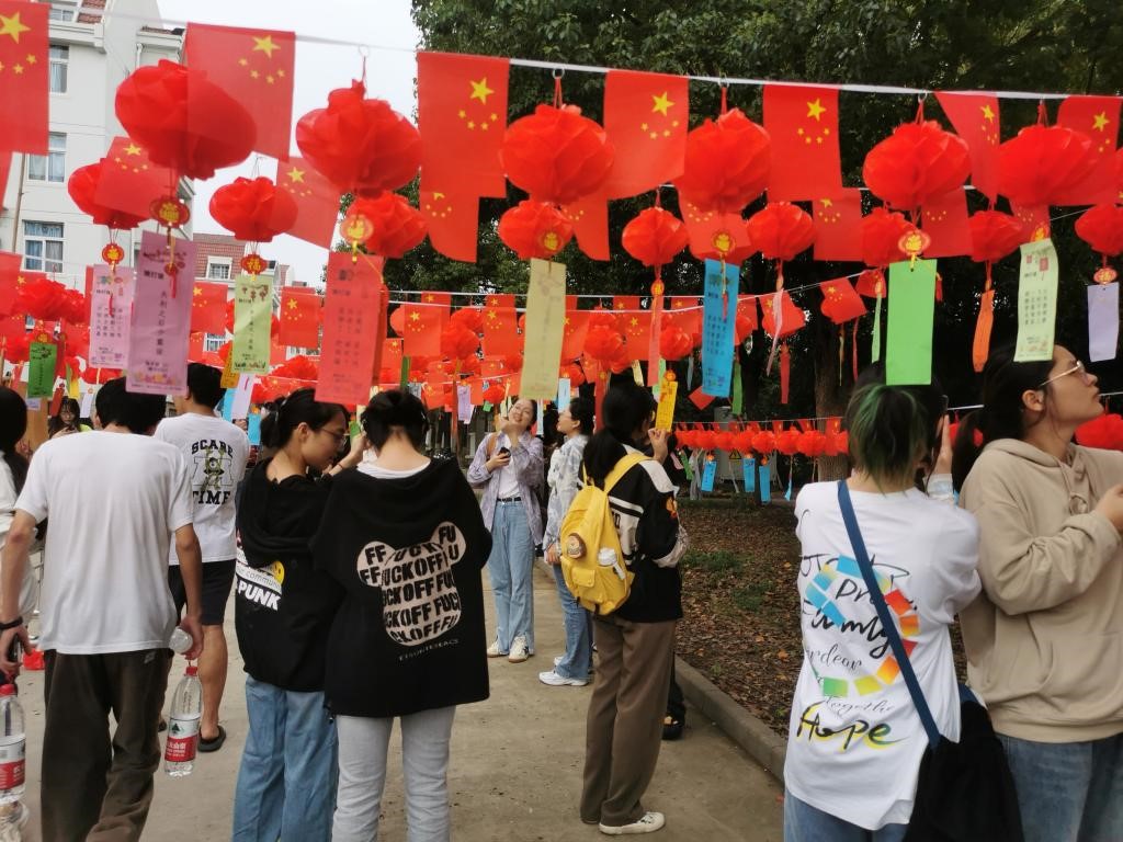 墨笔写下平安喜乐、万事顺意,彩色画笔勾勒出中秋月夜的别样多姿和对祖国的深情告白;彩纸慢慢糊上竹骨,花灯初见雏形,放入电子灯,固定好灯笼杆,花灯就制作完成了。工商管理学院、金融学院、财政与税务学院、经济学院的同学们开展了手绘花灯、猜灯谜活动。同学们表示,点点灯火中,所有的心都汇聚成一片浓浓的家国之情,中秋国庆双节主题活动既是对“国”与“家”的美丽诠释,也是对中华优秀传统文化的传承。