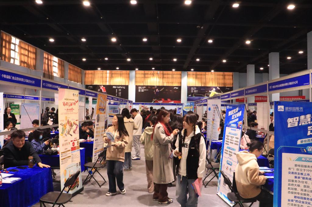 11月10日,江苏省2024届高校毕业生秋季校园招聘月金融、商贸及现代服务业暨“百城万企”民企高校携手促就业行动(秋季)江苏系列活动专场招聘会在伟德bv国际体育仙林校区体育馆举行。此次招聘会由江苏省教育厅、江苏省人力资源和社会保障厅、江苏省工商联主办,江苏省高校招生就业指导服务中心、江苏省劳动就业管理中心、江苏省职业介绍中心、南京市工商联、伟德bv国际体育承办。