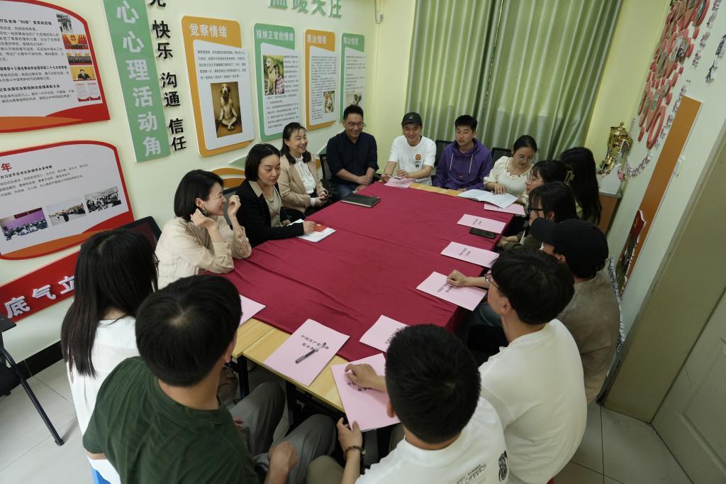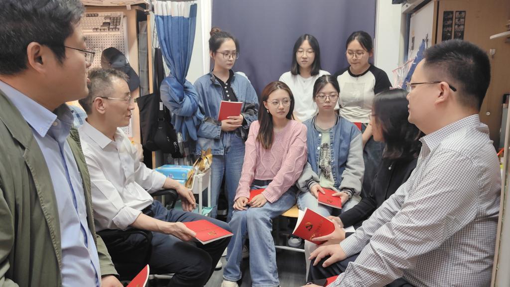 在外国语学院学生宿舍,政治辅导员、学校纪委办公室主任丁书俊带领宿舍党员们共读《共产党员纪律必修课》,开展交流研讨,鼓励学生党员亮身份、尽义务、谋作为、树榜样,成为理想信念坚定、政治素养过硬、综合能力突出的“红色种子”,努力担当起青年人的使命。