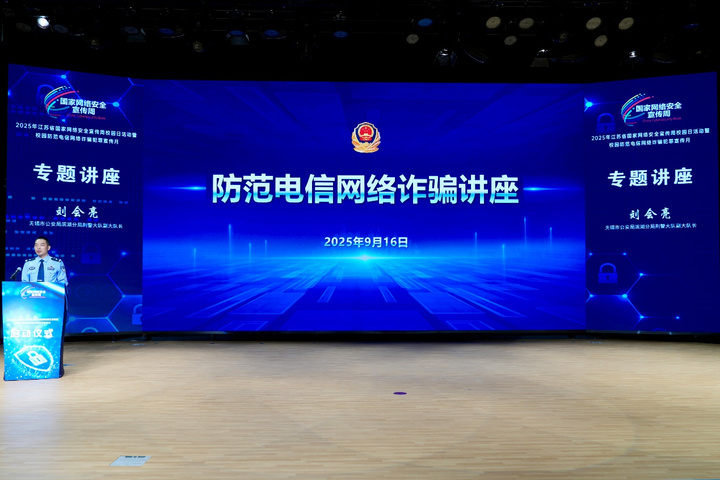 “一个电话、一条短信,骗子躲在境外就能把钱骗走!”9月16日,在2025年江苏省网络安全宣传周校园日活动暨校园防范电信网络诈骗犯罪宣传月启动仪式现场,无锡市公安局滨湖分局刑警大队副大队长刘会亮警官,带着亲身办案经历和鲜活案例,为全省大学生送上“反诈指南”,从法律定义到跨国抓捕,从陷阱拆解到防范妙招,每一个细节都让在场学生直呼“干货满满”。